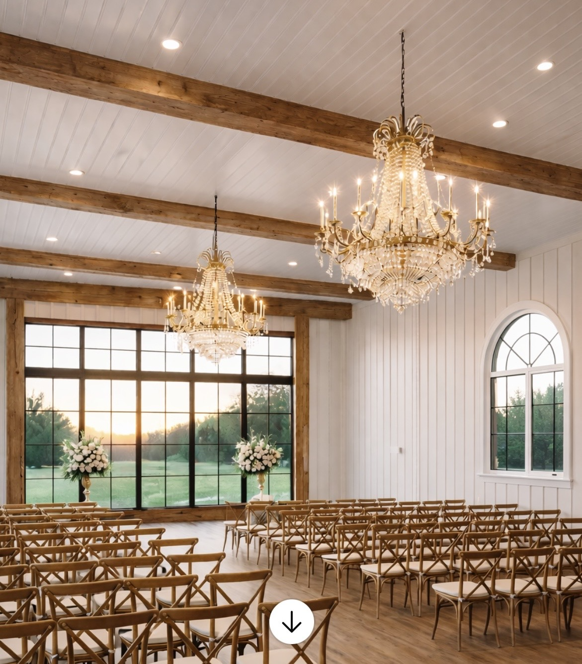 Currently being constructed, this space features white shiplap walls, large timber framed windows, and breathtaking western sunset views. Conveniently located next to the groom's suite and just outside the bridal suite, it allows for a grand entrance through the striking wooden doors. Arched windows frame the patio door, seamlessly connecting the indoor space to the outdoors. Complete with a built in sound system and bar, this room is perfect for both your ceremony and dance celebration.
