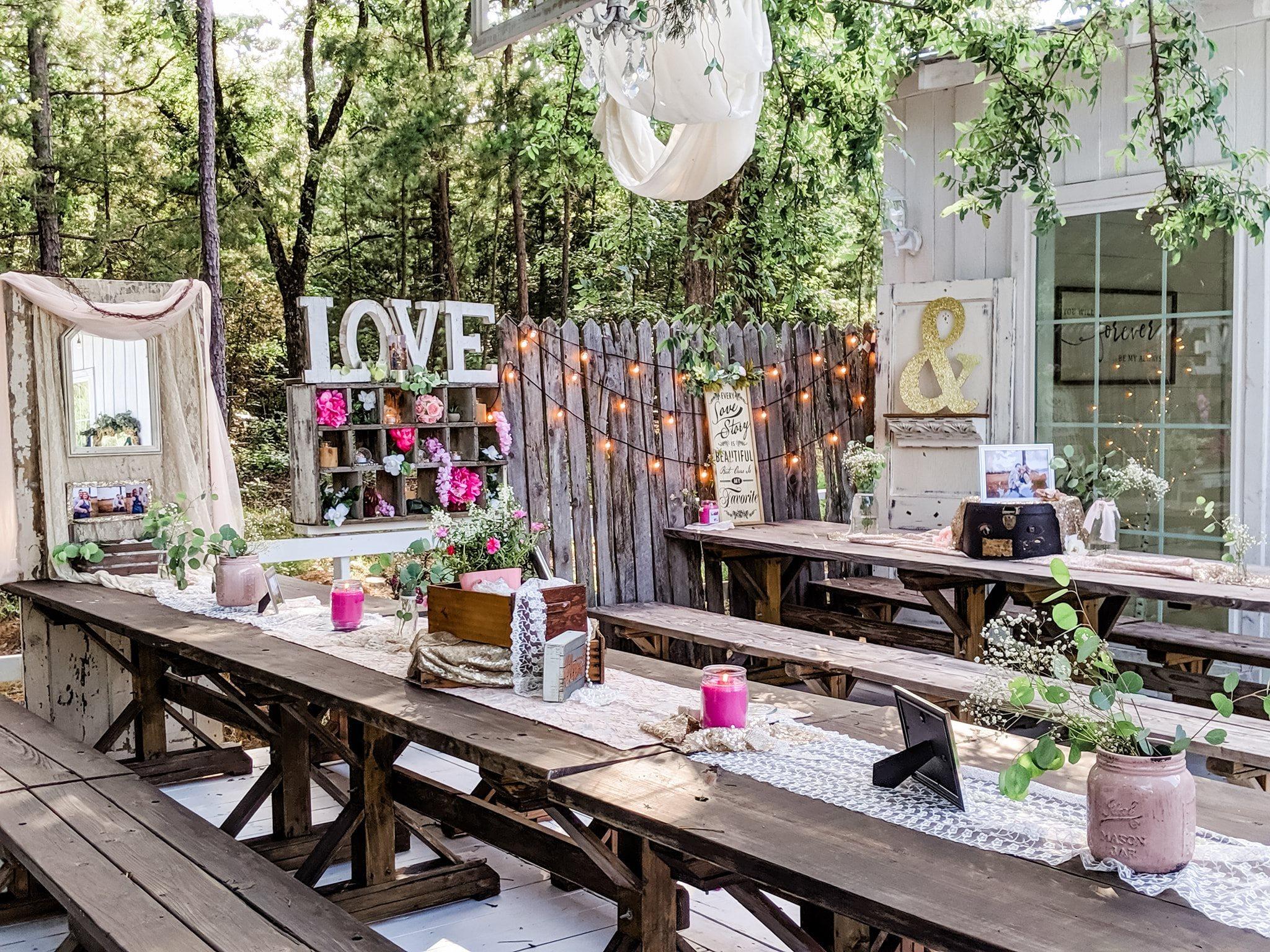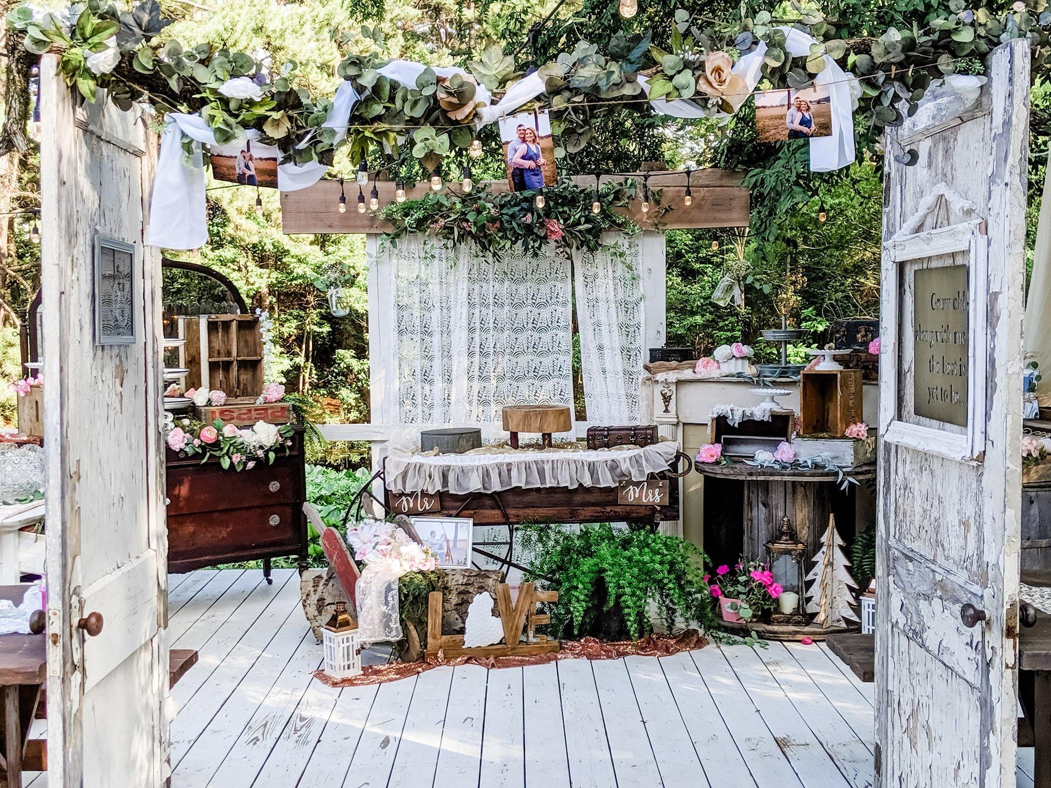 With dreamy outdoor lighting, a country-chic bridal suite, quality vintage furniture, endless decor possibilities, a full kitchen, grooms suite, multiple dance floors, a wrap-around deck, and multiple ceremony locations — the staff of Pistols & Pearls can help you plan the event of your dreams.