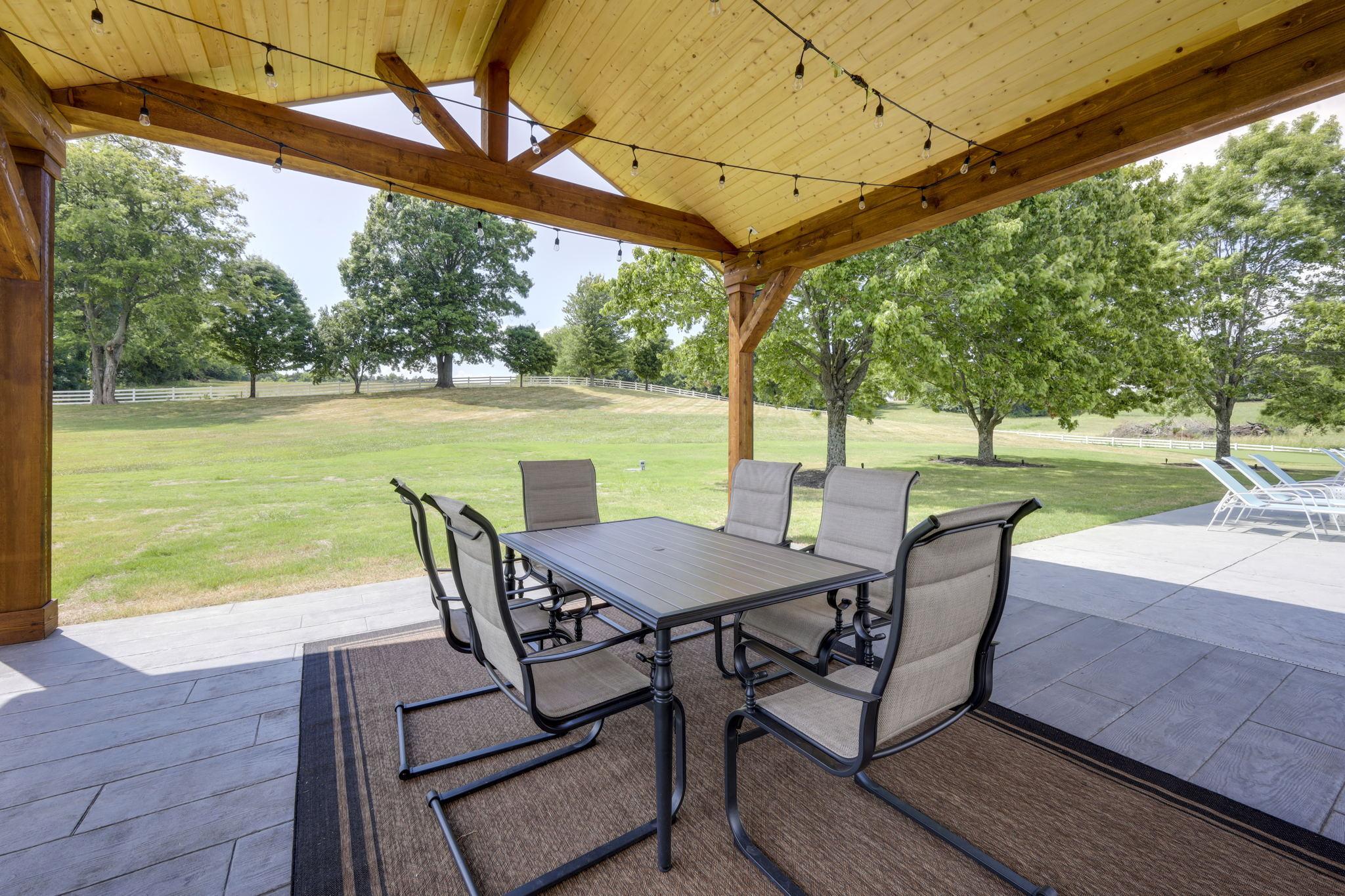 Ample space for cocktail hour, social gathering, ceremony and more! You can make this space what you want it to be with the peace of mind, that weather will not effect your event! The covered poolside gathering area also features a gas grill, large marble counter space and a fridge. With outside lighting, it makes the space come alive and illuminating at night.