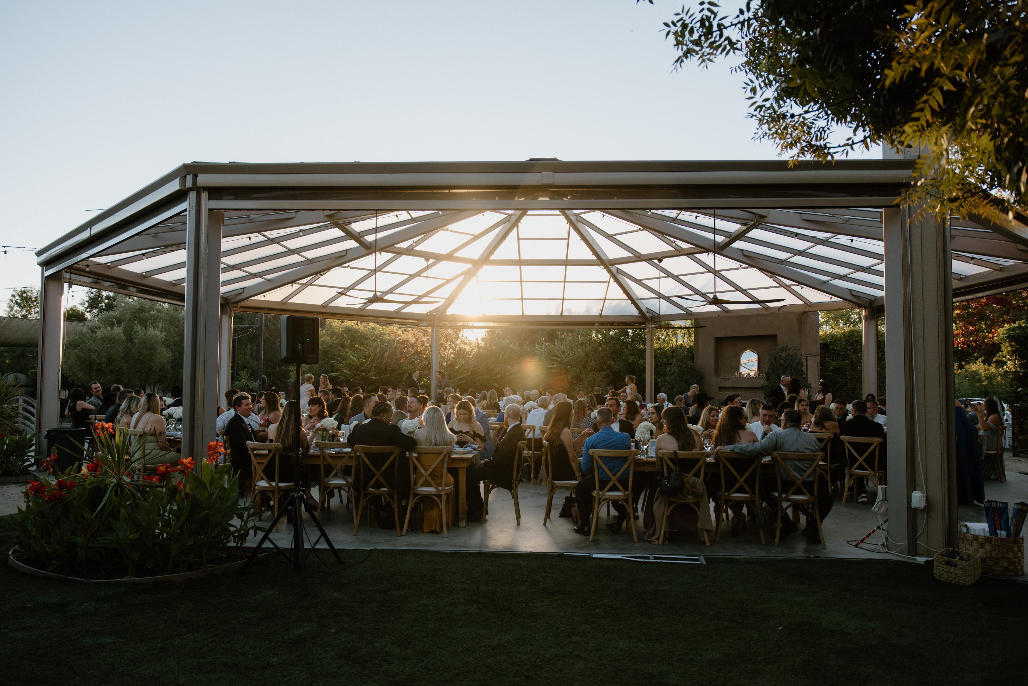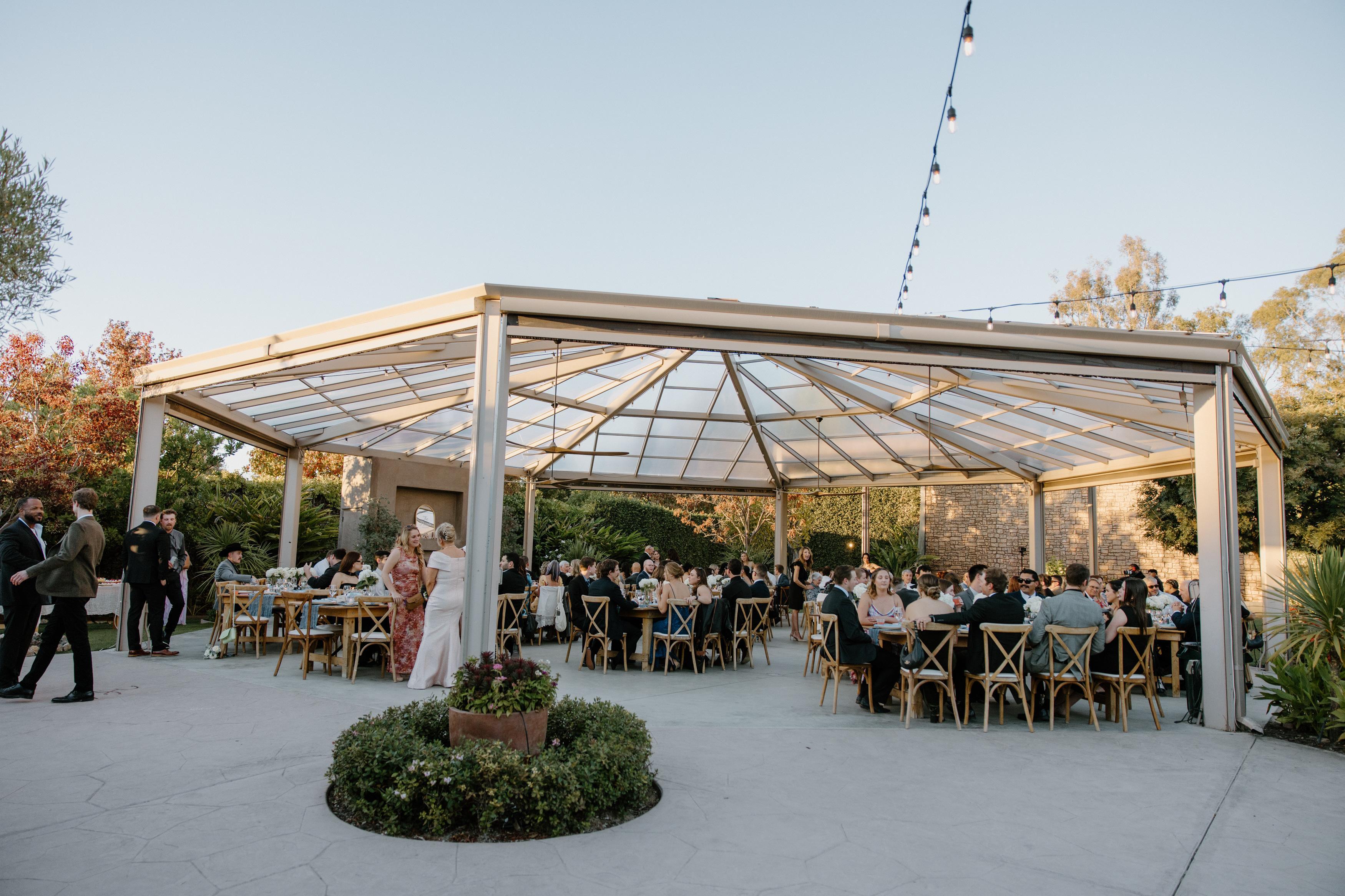 The Conservatory is a covered garden atrium that comfortably seats up to 250 guests under our rainproof glass ceiling (rain plan anyone?!) It is the perfect indoor/outdoor space for your reception.