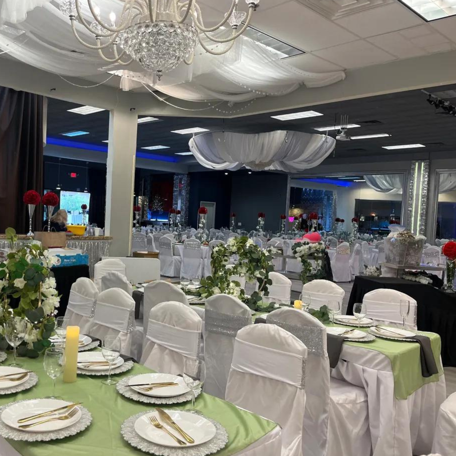 This room includes everything you need for an exceptional event experience. Enjoy flexible seating arrangements with banquet chairs, round and rectangular tables draped in elegant linens, and beautiful artificial floral centerpieces. The space comes with a complete audio-visual setup, including a Bluetooth speaker system, microphones, projector, and a 75" TV. Also included are a dedicated bartender, on-site servers, and a bridal/changing room for convenience.
