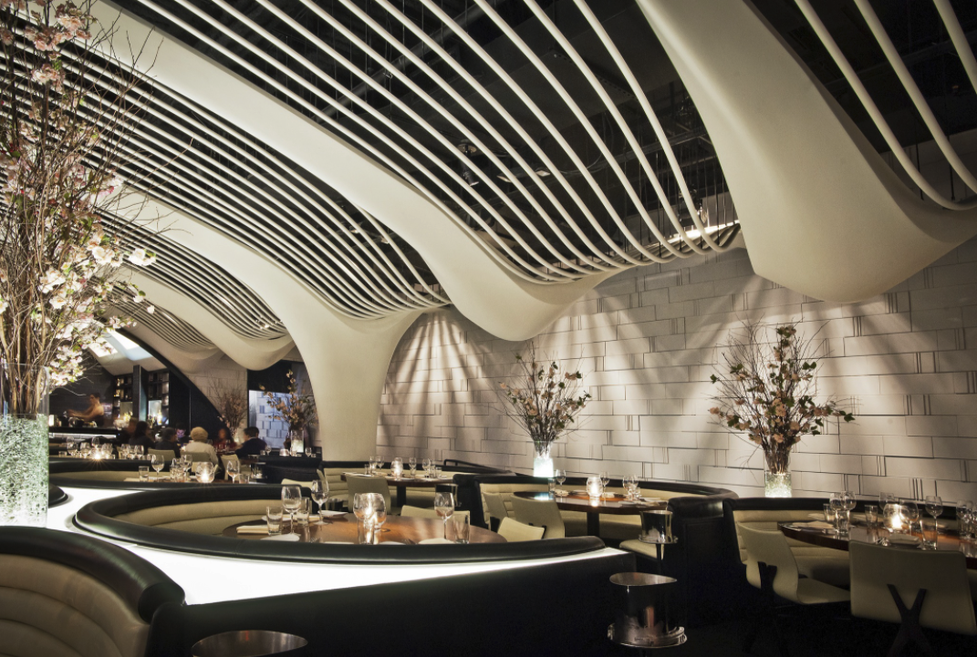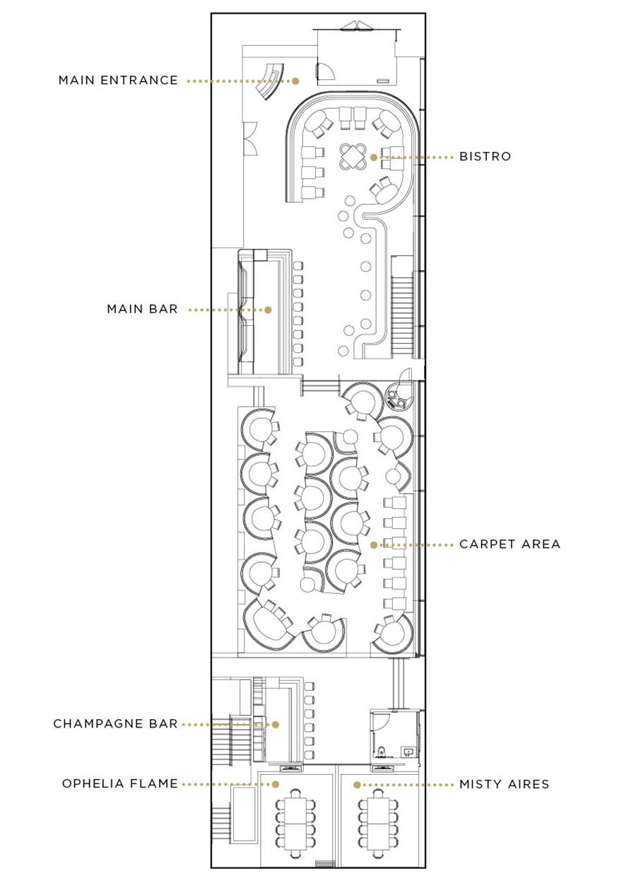 • Ideal for: Buyouts, Seated Lunches & Dinners • Can accommodate up to 250 when combined with the private dining rooms • Furnished with creamy leather banquettes and textured crocodile leather, accented with a dramatic ceiling & theatrical lighting • This space features two white marble bars, DJ booth, and fireplace to create the ultimate atmosphere • This space can accommodate AV • Additional staffing fees may apply