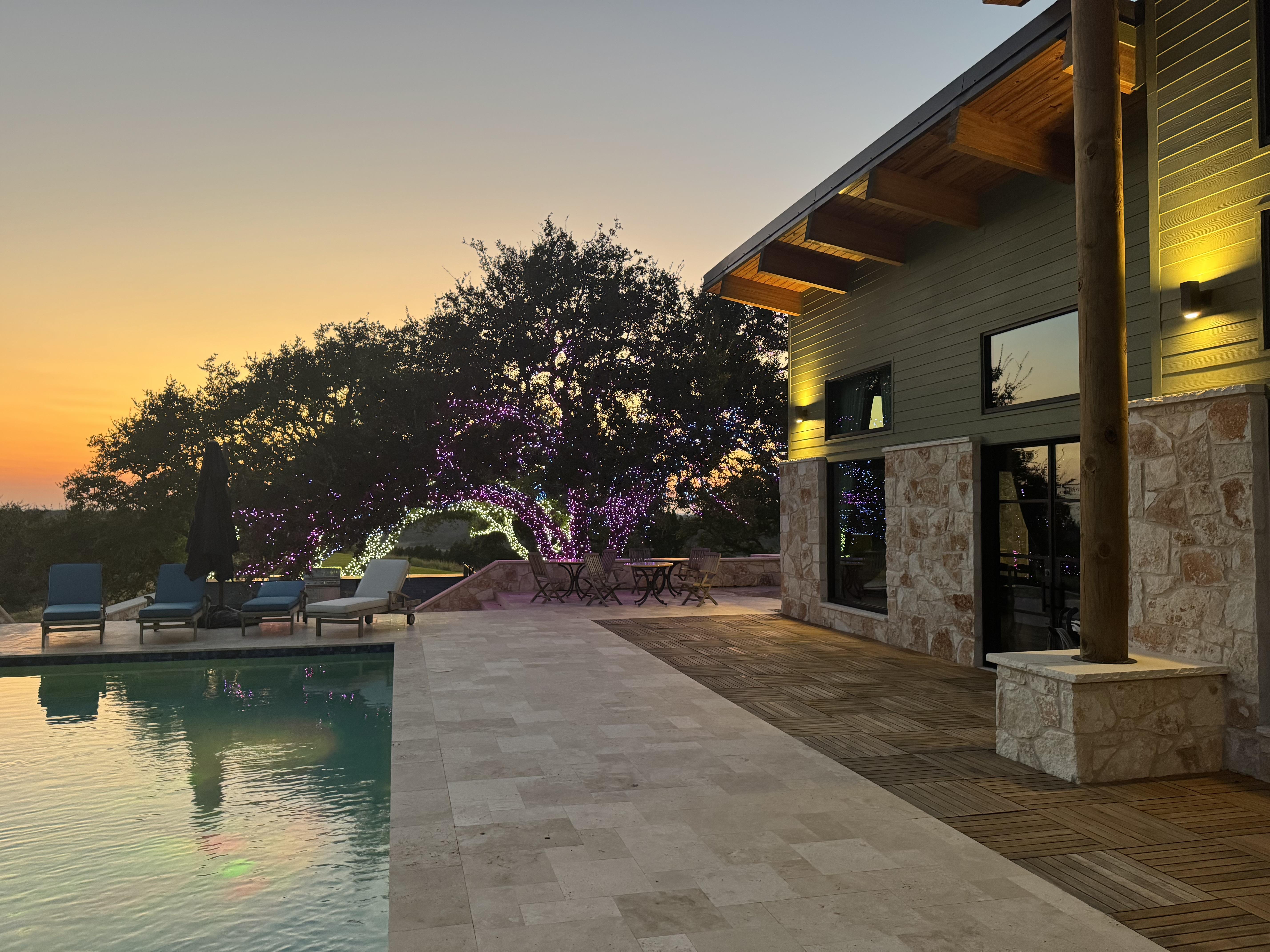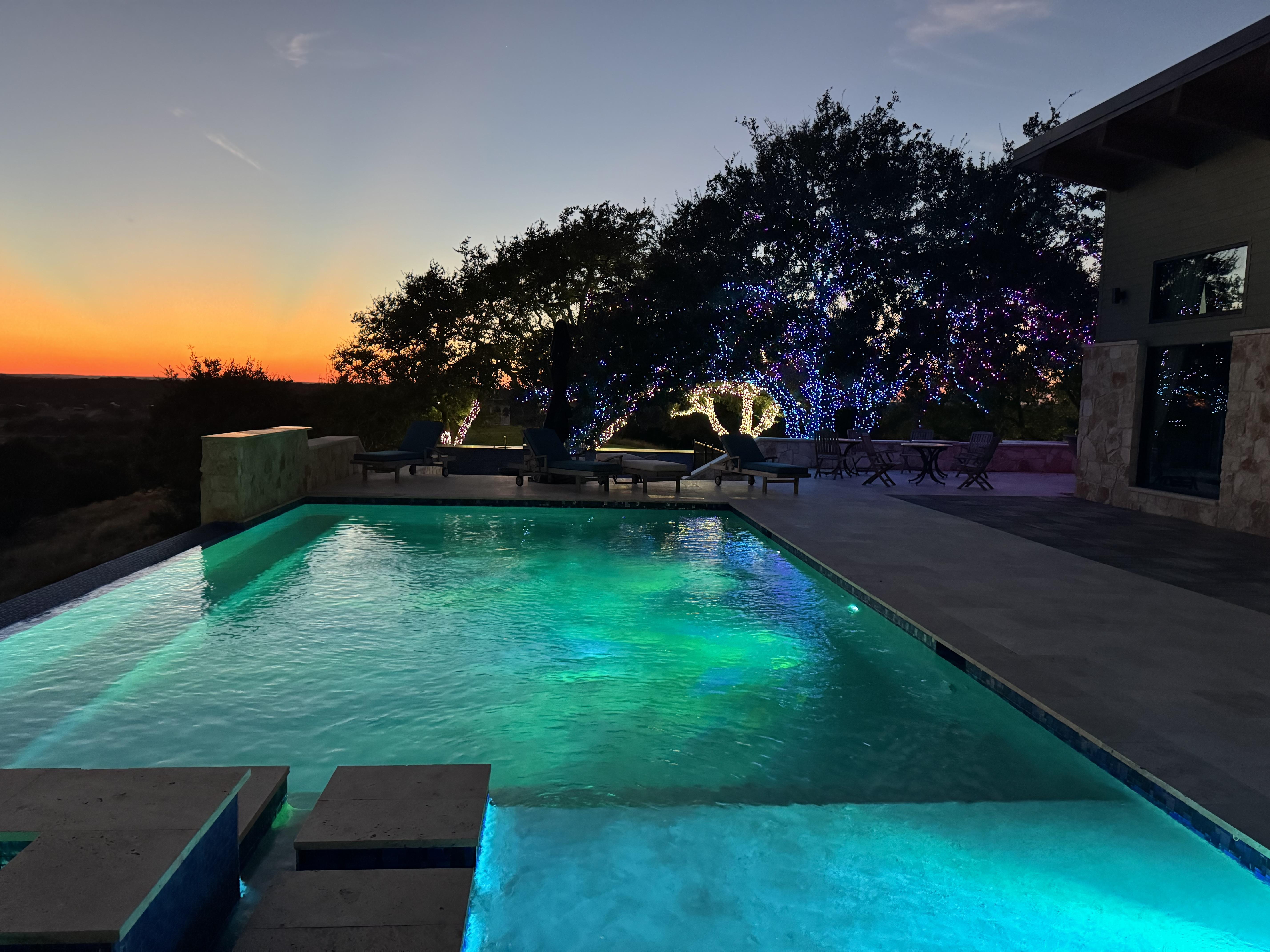 Pool area that connects to the great room and bar. Spectacular pool surrounded by well lit trees. Views are sensational. Space is large and this is the perfect place for either cocktails after a reception or dinner on the lawn.