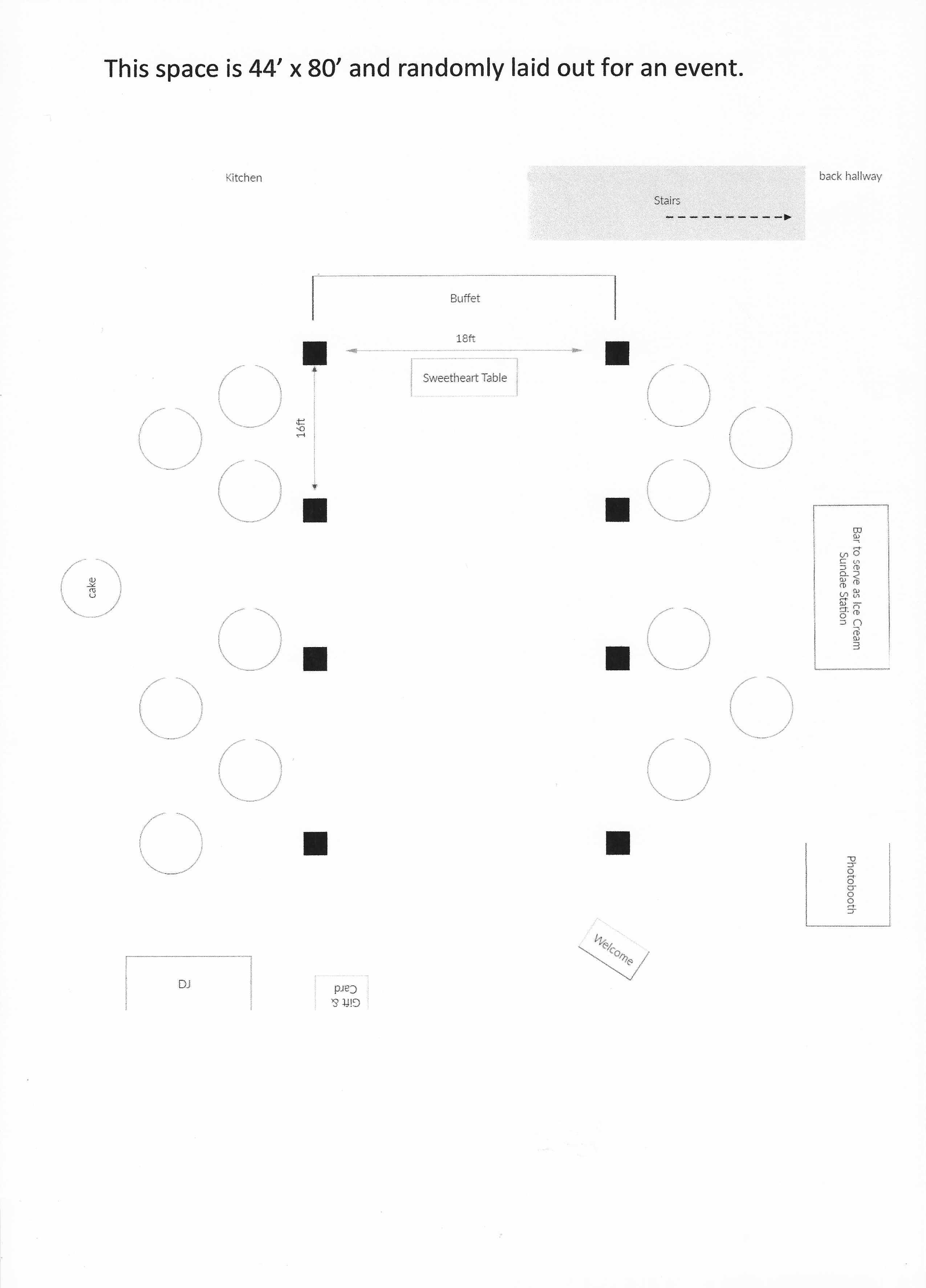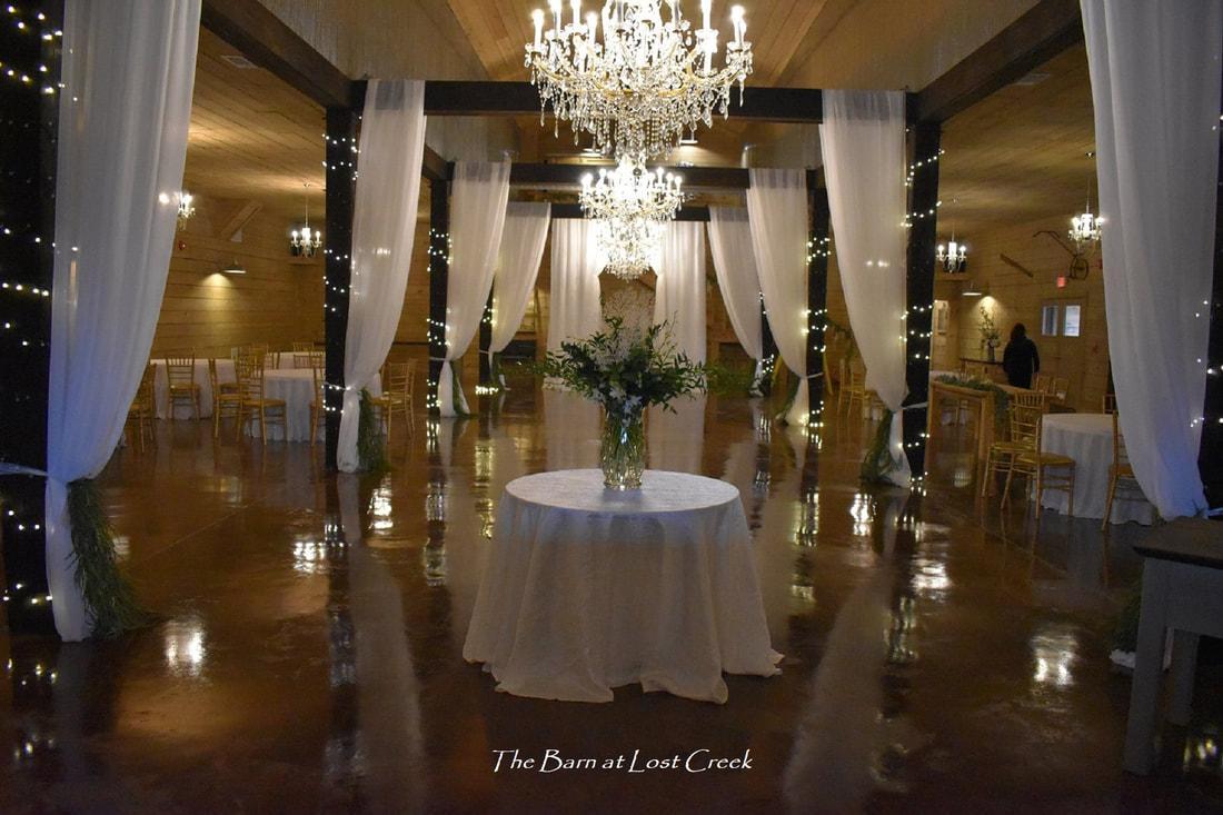 We have a rustic post and beam ambiance with beautiful chandeliers with dimmers, stained concrete floors, JBL sound system, open bar, and a variety of rustic tables for food, cakes, gifts, etc.