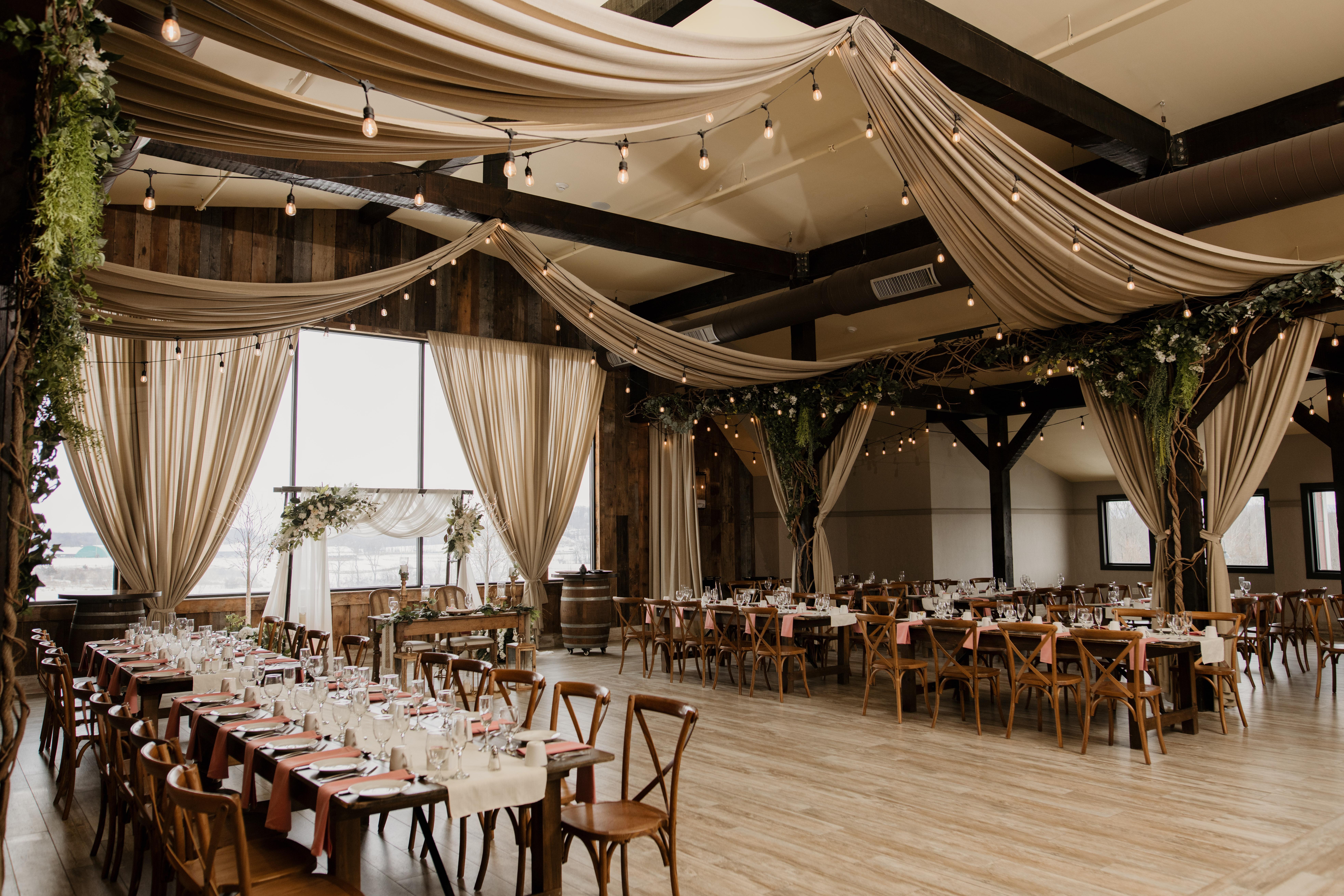 Perched on the second floor, the Farmview offers a more intimate setting with a view of the surrounding countryside. With space for 125–150 guests, it’s ideal for midsize weddings, cocktail hours, or events that deserve a quieter kind of beauty—with just the right mix of charm and functionality.