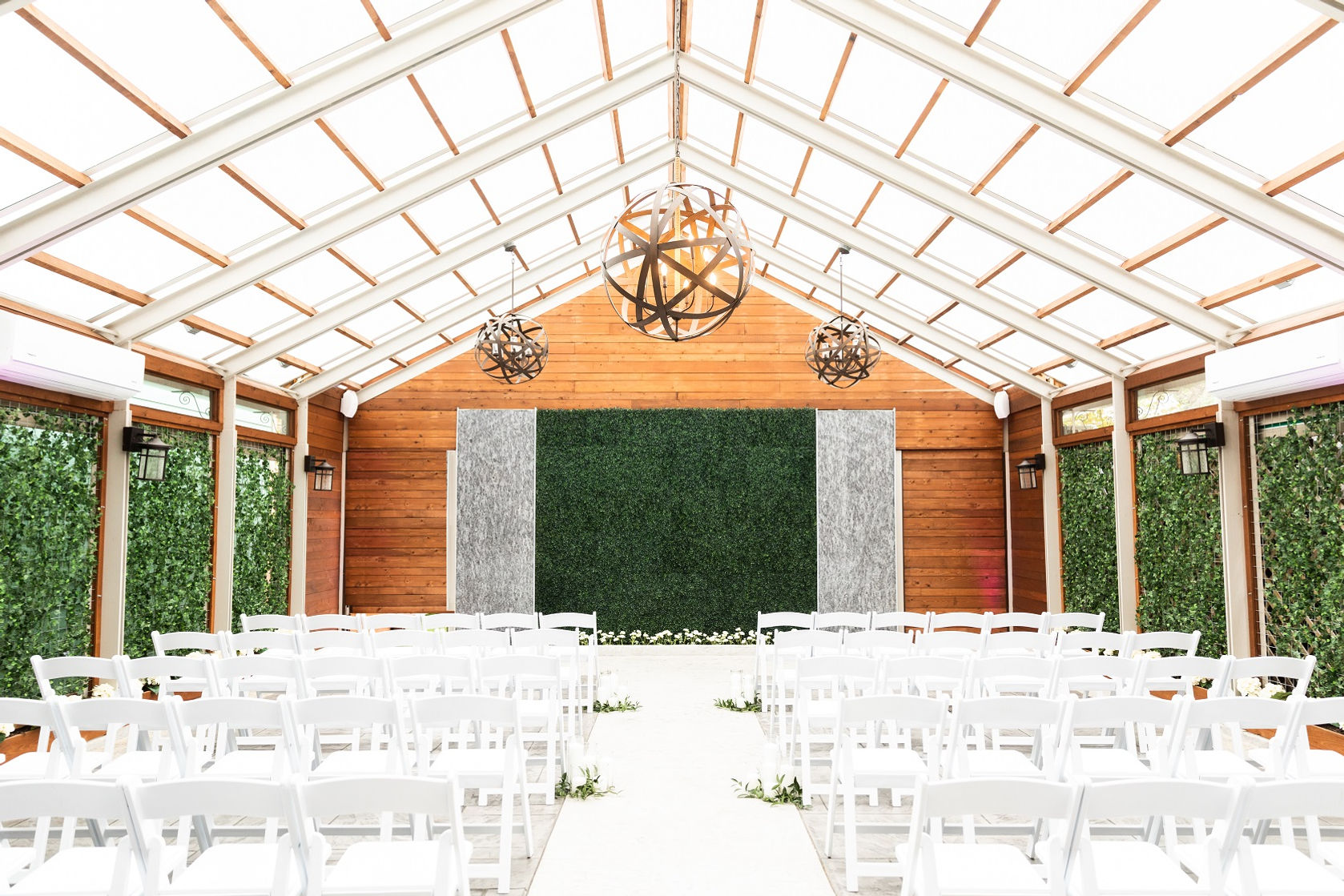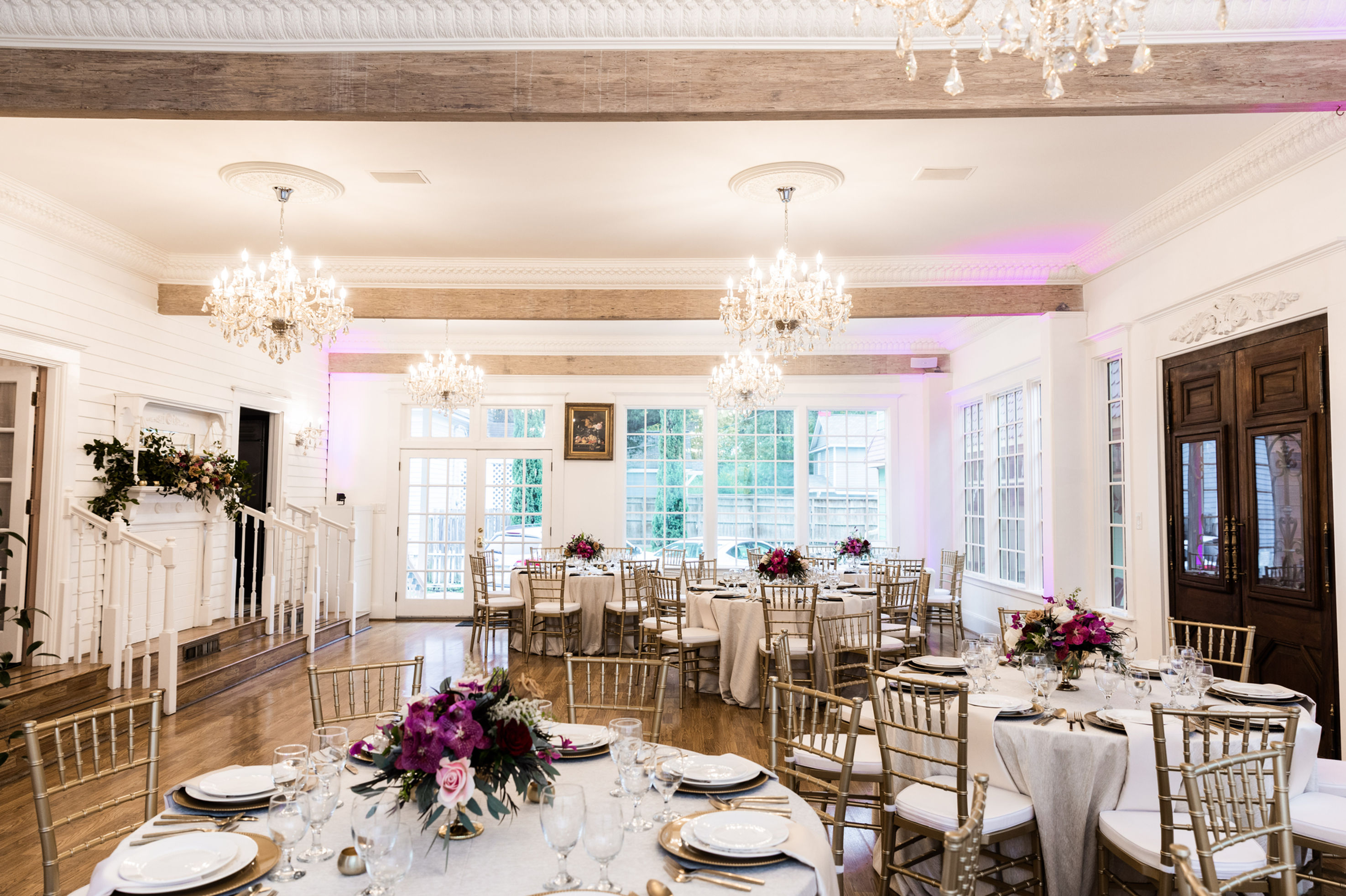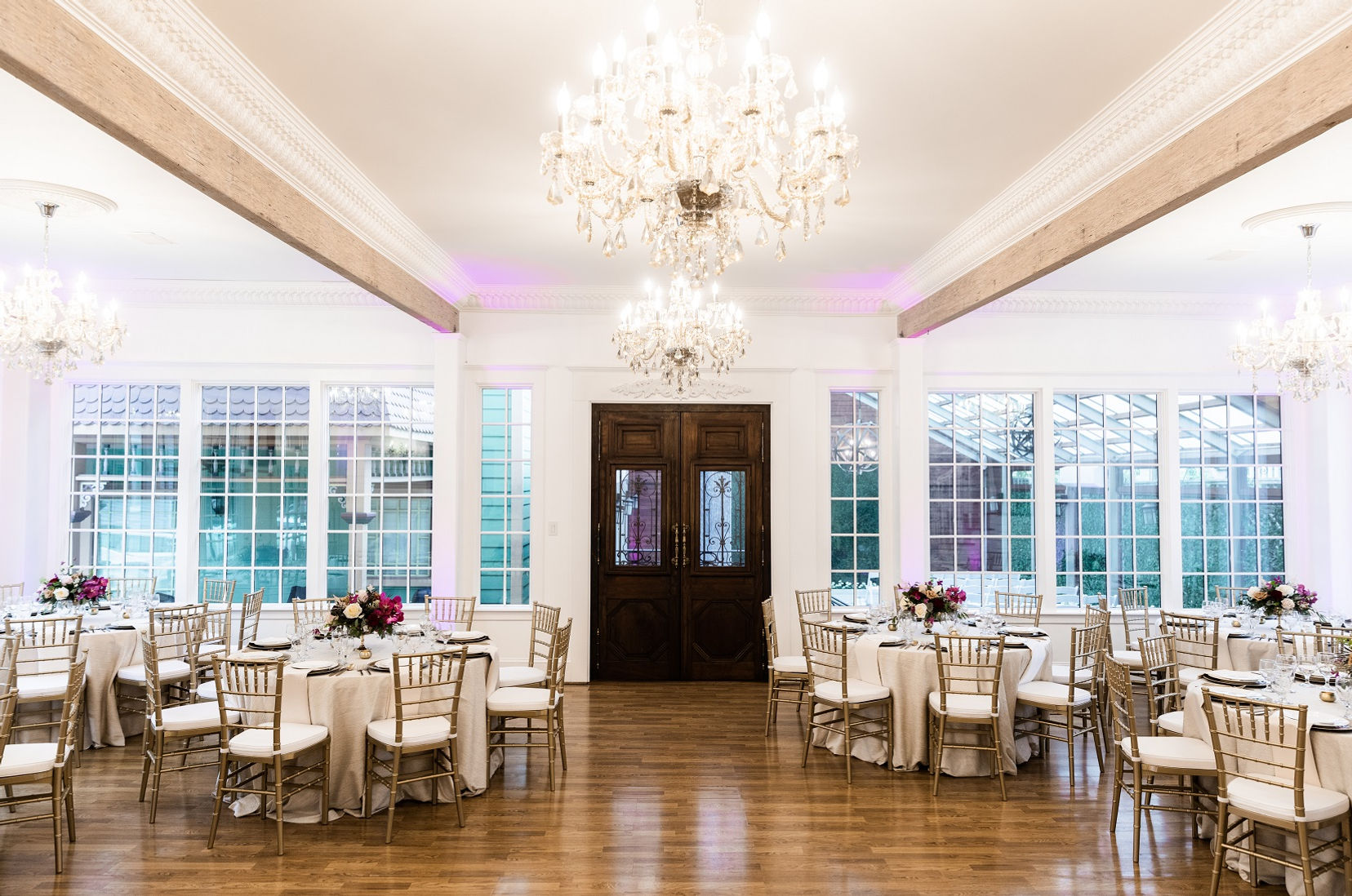 The Belamour, French for "beautiful love," provides the perfect setting for having your wedding ceremony and/or reception. The Garden Pavilion is the perfect ceremony location known for the ample amounts of natural lighting and the green, boxwood backdrop. This climate controlled space can be transitioned after your ceremony into a casual cocktail setup or a formal affair for those wishing to have a garden dinner reception. Adjoining, you will find the crystal chandelier lit dining room. This elegant space allows for a formal sit-down dinner or cocktail style event. The Belamour can accommodate up to 102 guests for ceremony and reception, or up to 120 guests for reception only.