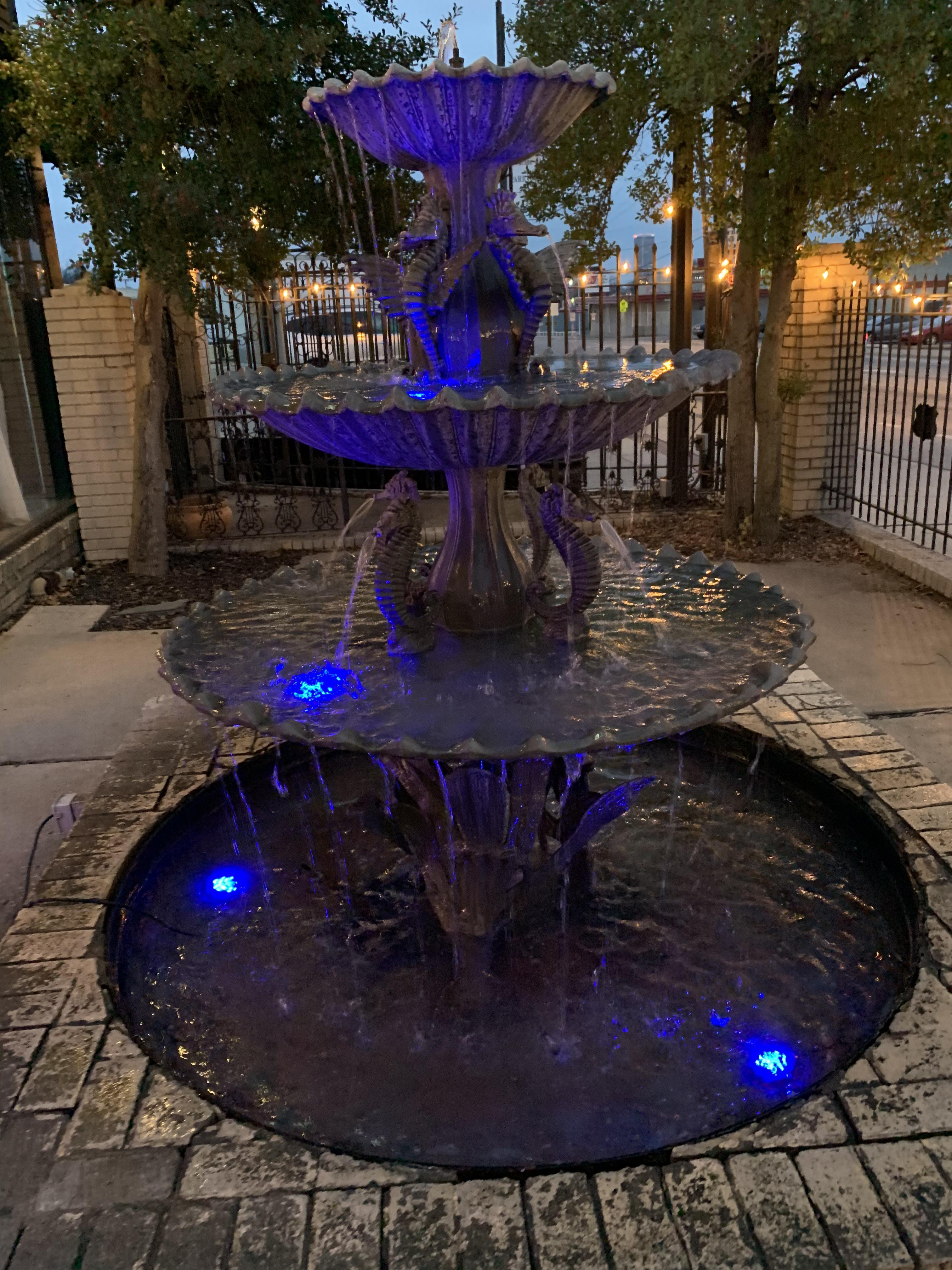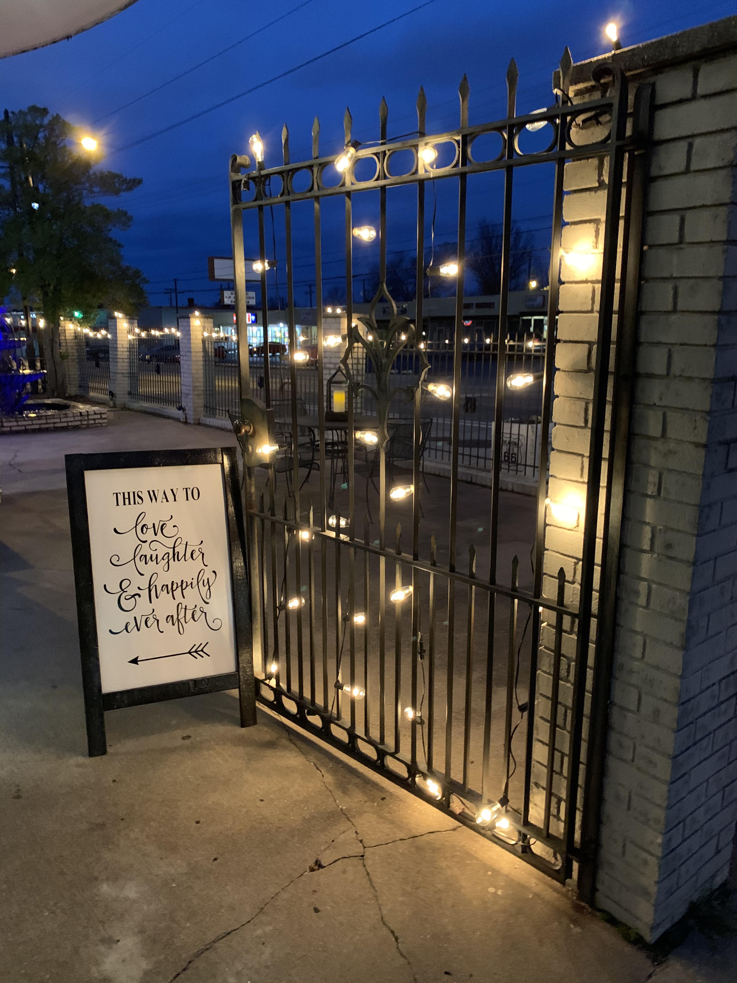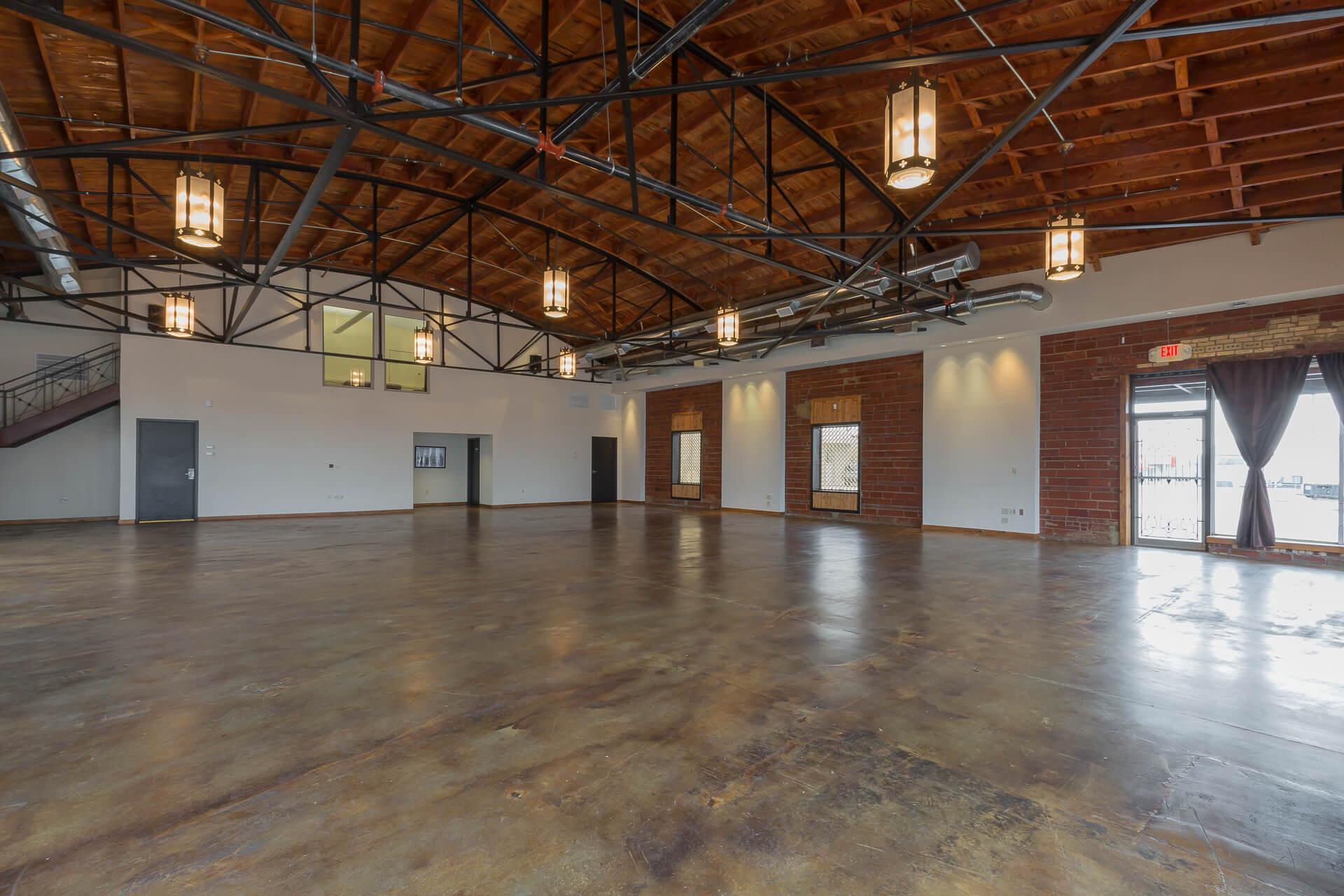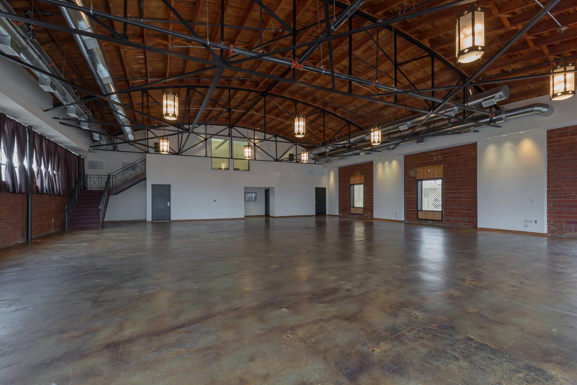 This space is in a separate building from the hotel. It offers a casual, rustic element to your event with a concrete floor and ironwork trusses. This space offers a loft suite with a restroom for dressing or privacy, which overlooks the event center and a small catering kitchen. The kitchen offers a refrigerator, restaurant size ice maker, sink and table top for prep. Bonus is the entrance courtyard featuring beautiful iron, and an ornate fountain.