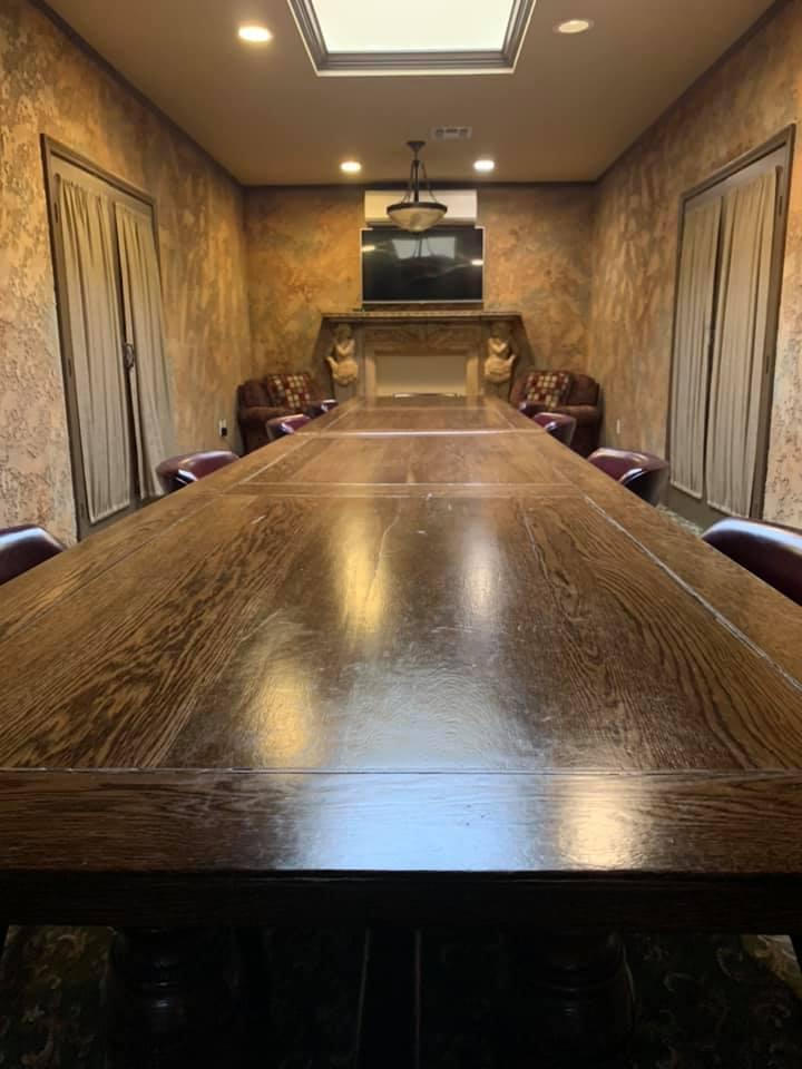 - Large wood boardroom / meeting table - 8 chairs - Television