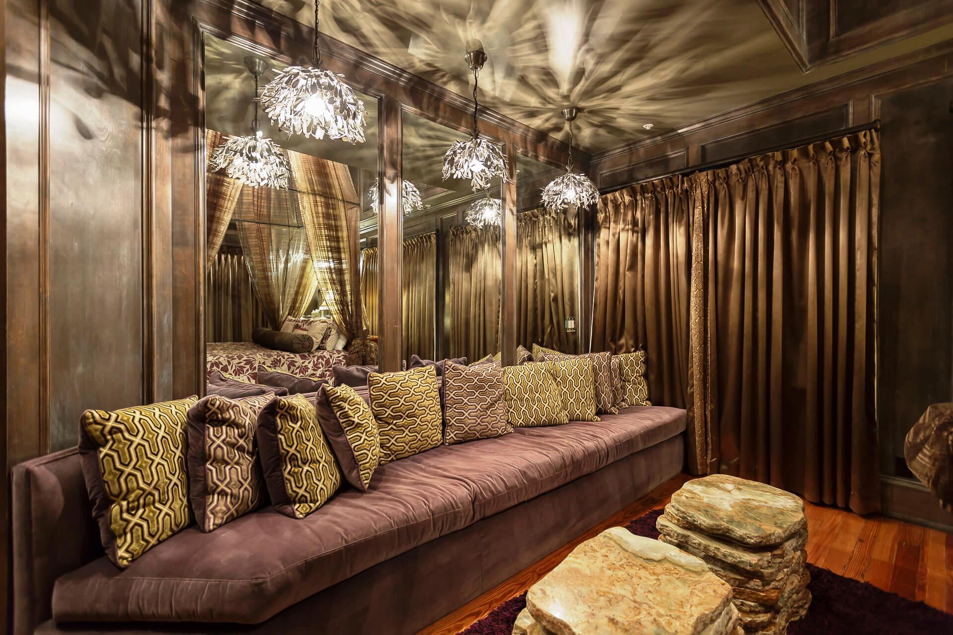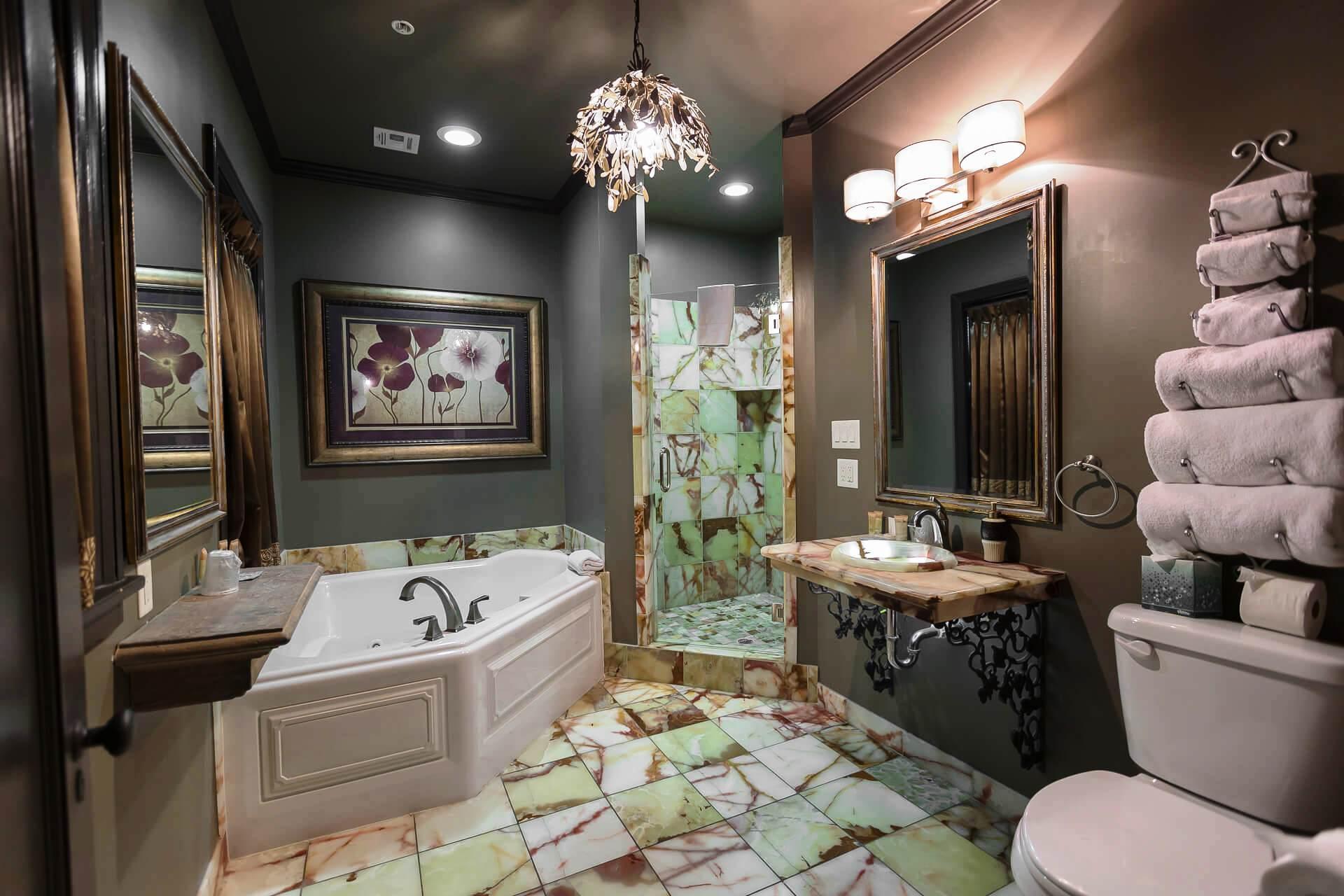 You will be swept away when you set foot in this amazing guest room. This king suite features a sleigh bed, a custom purple velvet sofa, mirrored walls, a fabulous bath with onyx tile, two person jetted tub and a stand alone shower with dual heads.