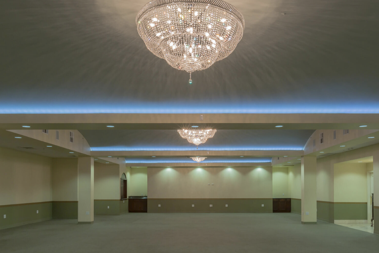 Tables - Banquet Chairs - Dimmers for total lighting customization - Chandeliers - Ceiling-mounted projector - Optional floor for dancing.