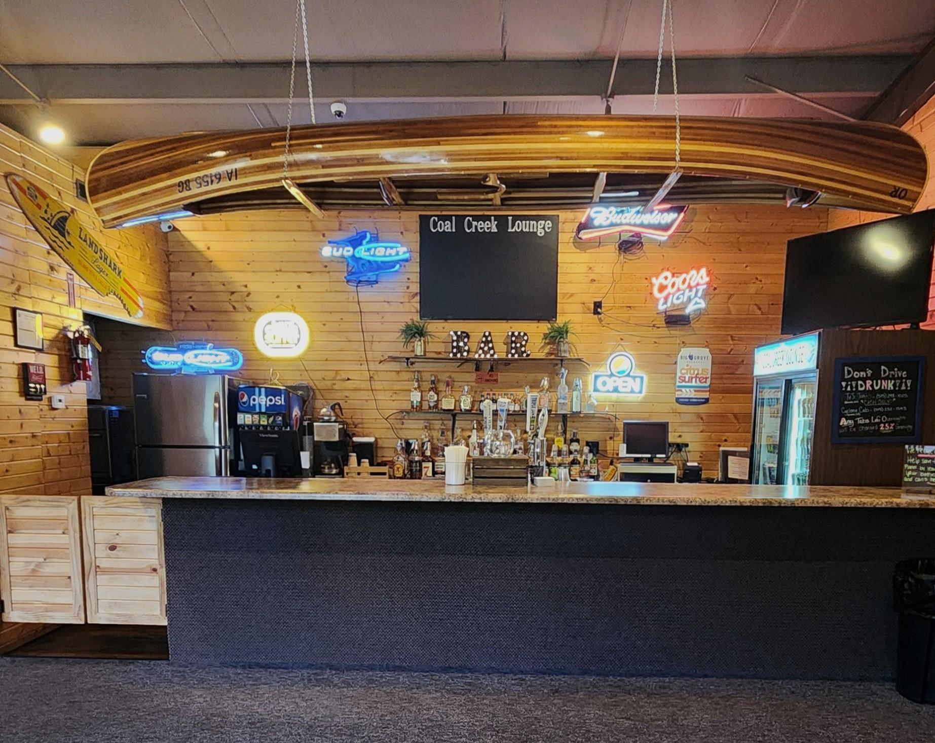 This space features 3620 sq footage with seating approximately 200 people. Back of the main lodge is our Coal Creek lounge which carries a large selection of local, craft, and domestic beers on tap and in bottles. Multiple options of wine, specialty mixed drinks and non-beer options are also available. Access to our outdoor lighted courtyard with tables, chairs and umbrellas.