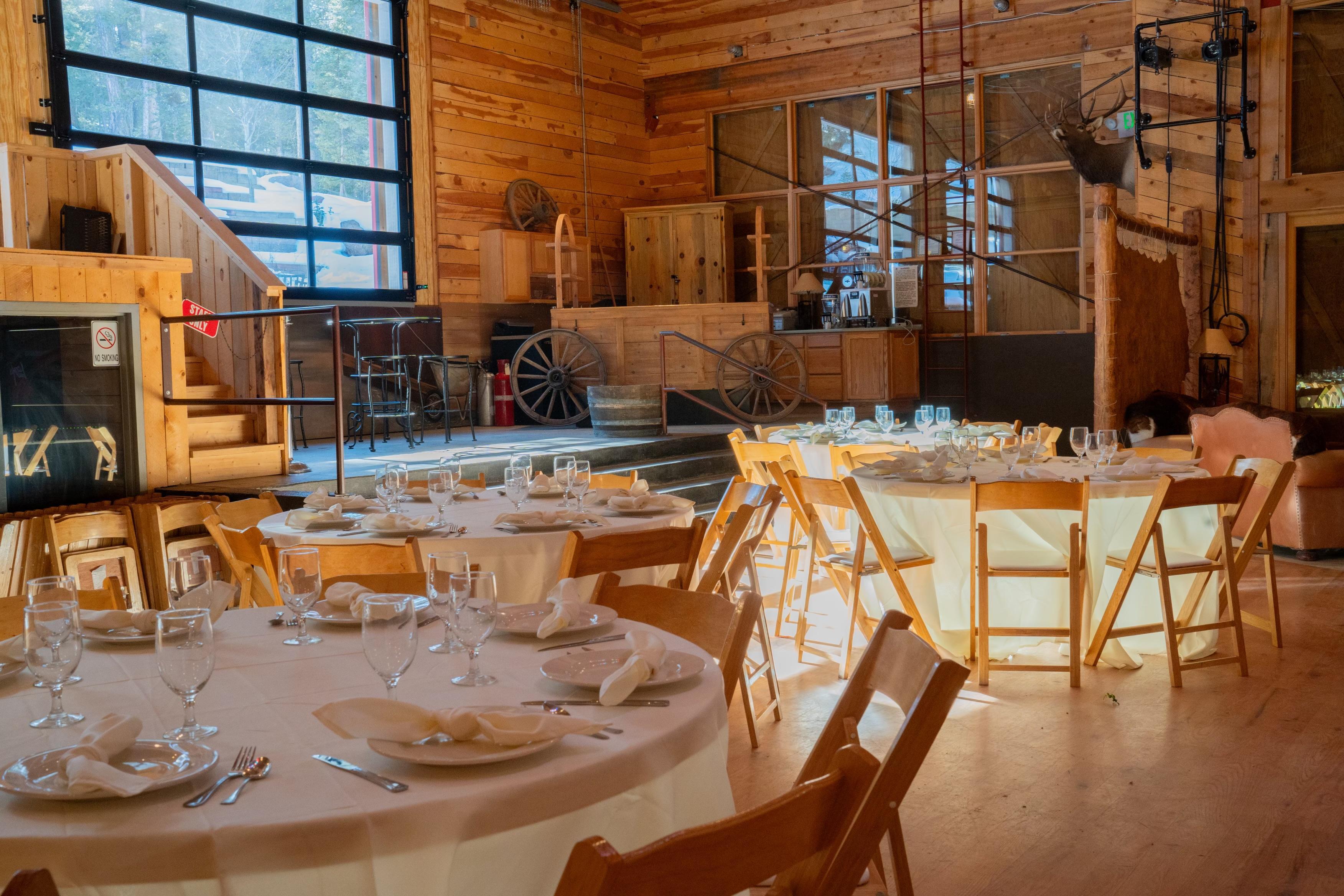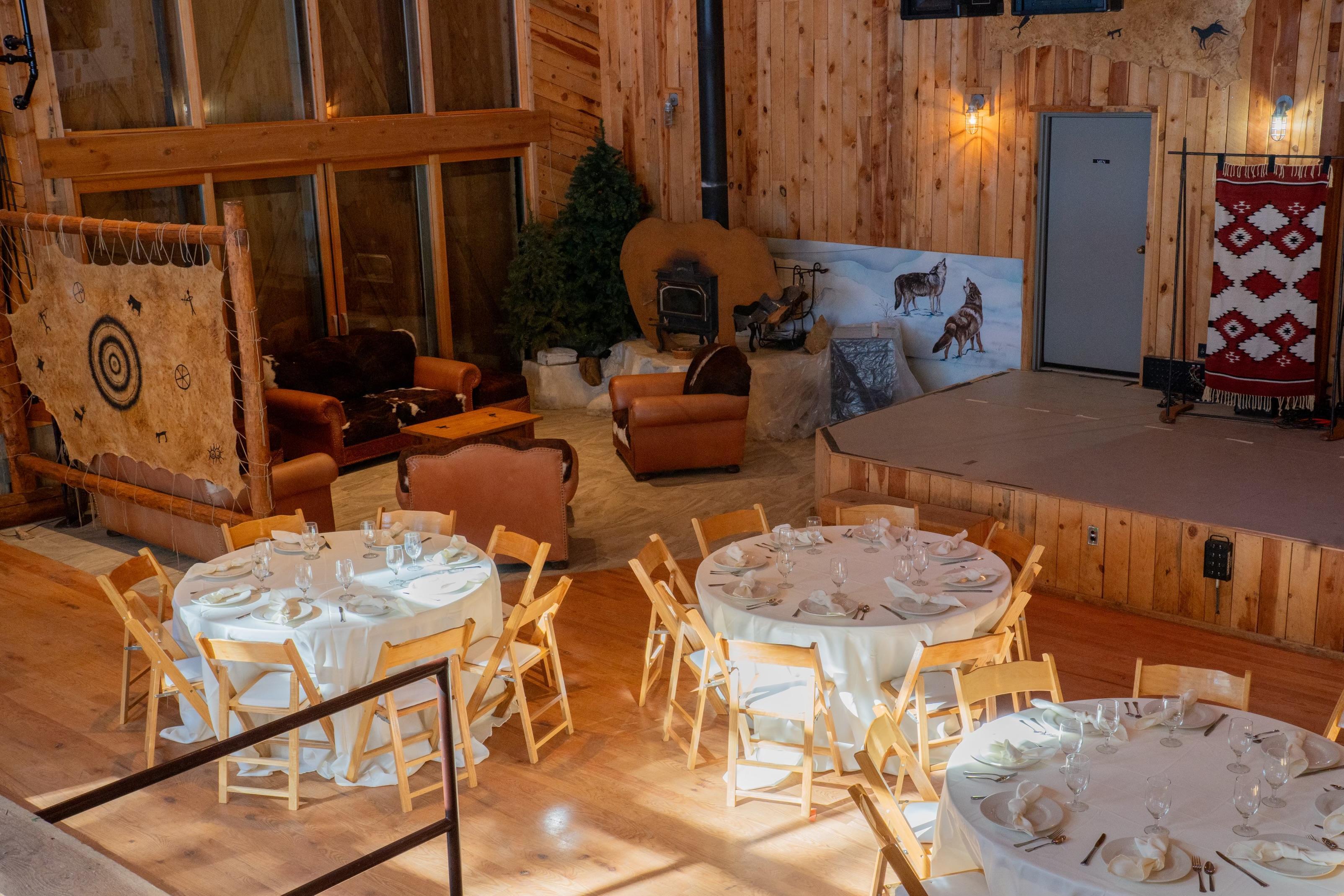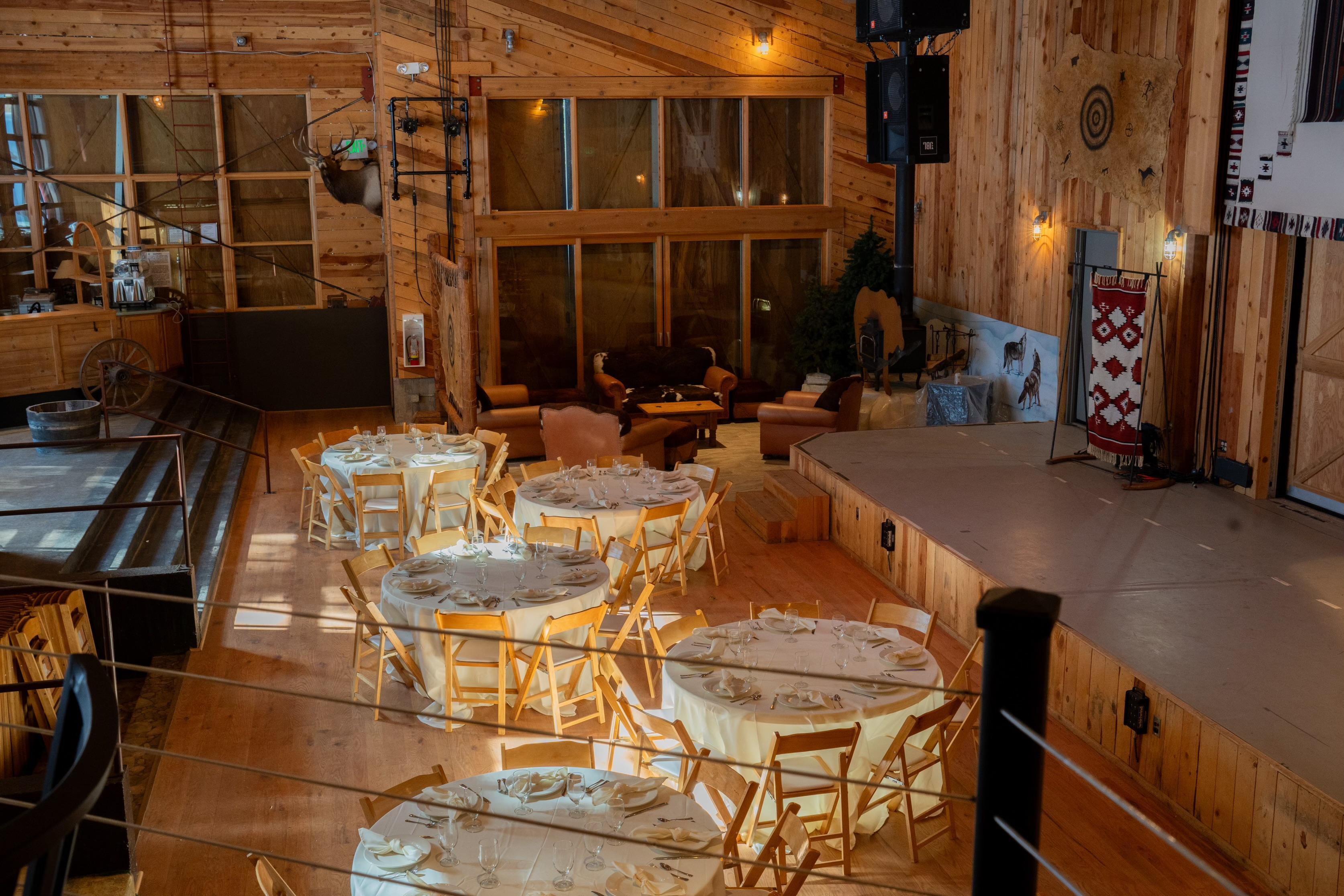 This space includes a main floor for dining and dancing, a loft with views of the main room, and an outdoor seating area nestled behind the venue with seating outdoors among the aspens, alongside a beautiful pond with rock formations. Also in the outdoor space there is a volleyball court, outdoor fire pit, horseshoe pits and walking path around the pond.