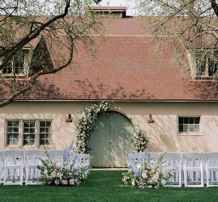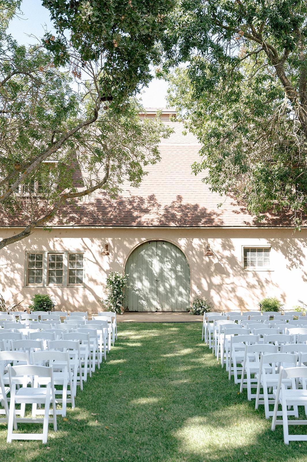This ceremony site includes lush green lawn, 3 mature trees offering stunning dappled lighting and unique green doors that you can decorate to personalize!