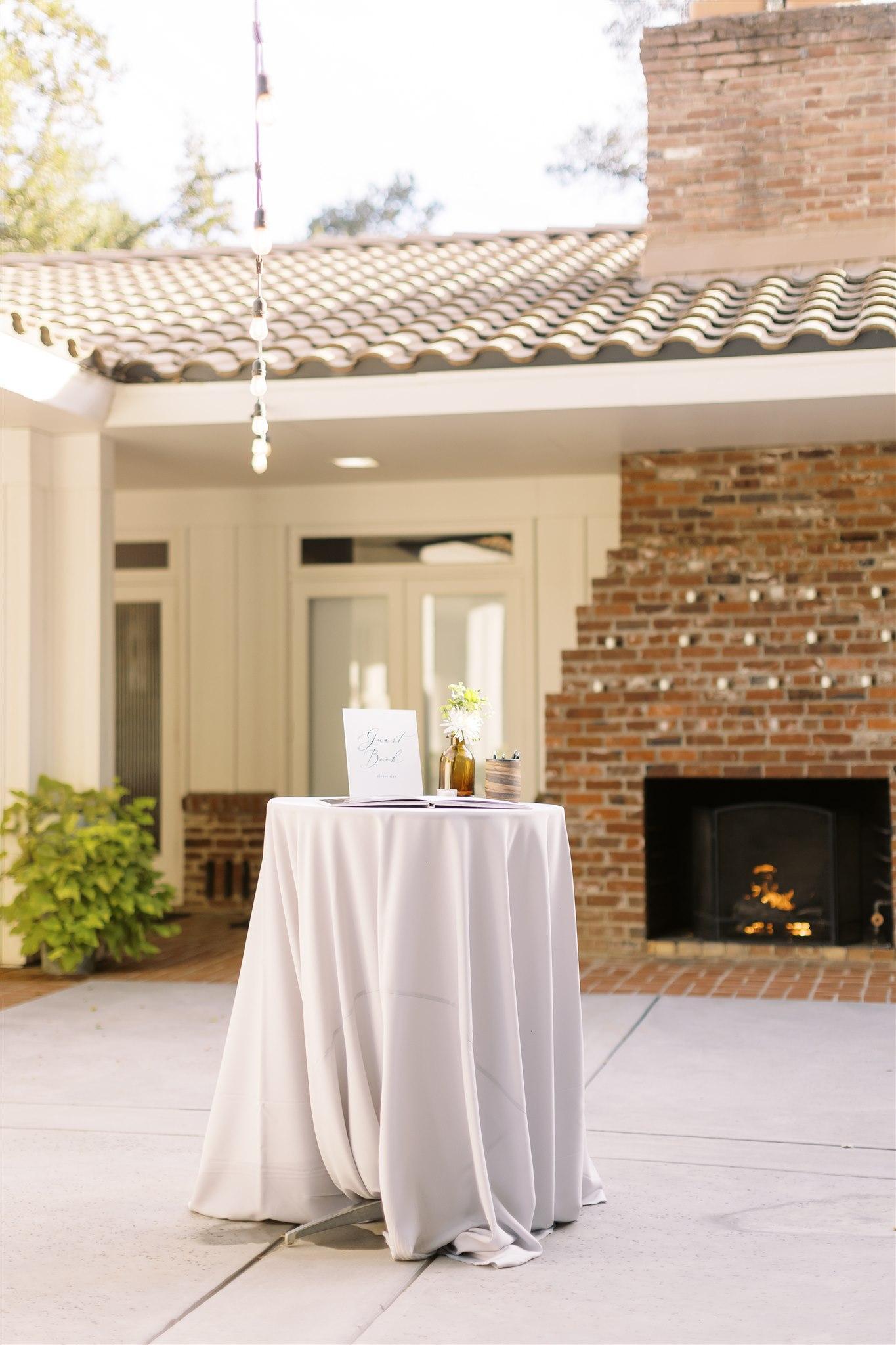 This wonderful space features a large hearth focal point which can be decorate with candles, florals or signage! It is surrounded by mature trees and white rose bushes with views of the lawn and the pool.