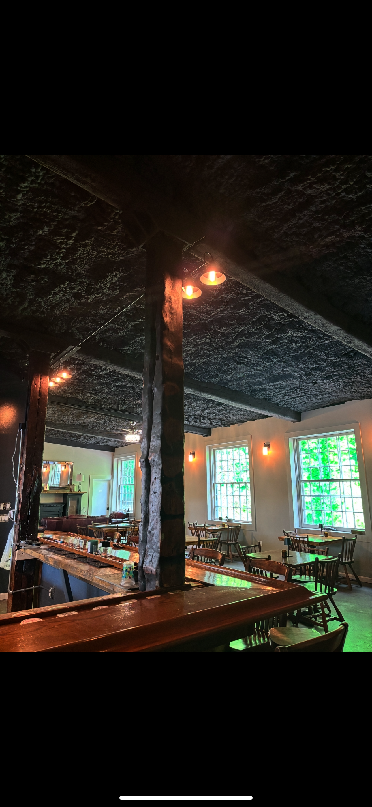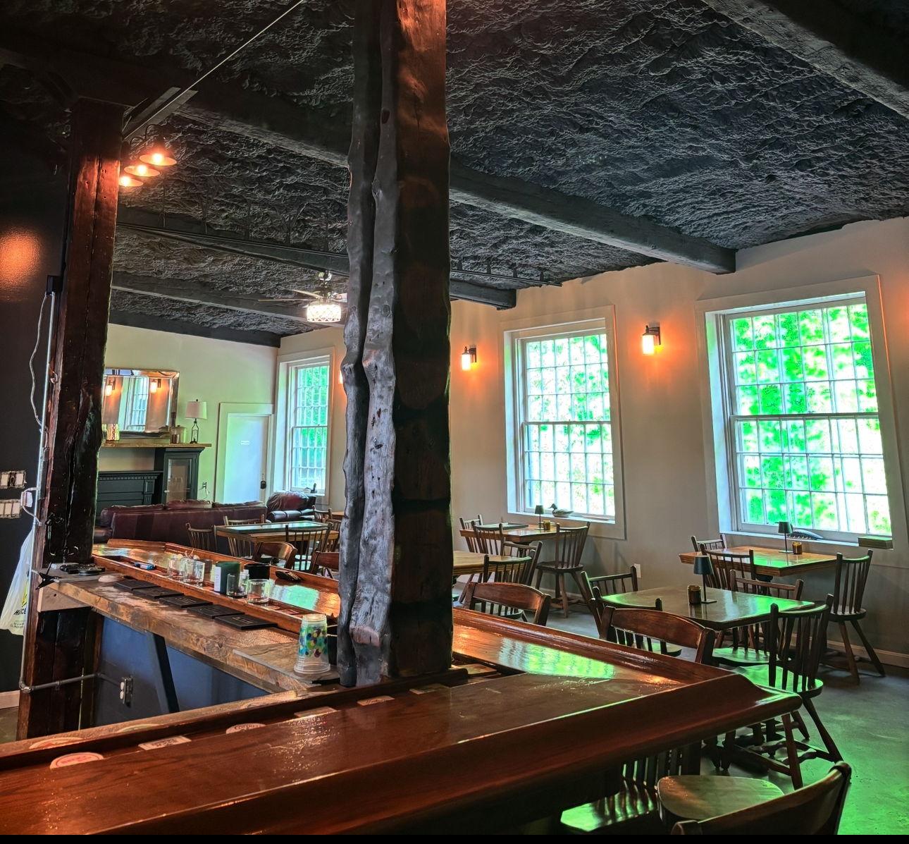 Dimmed lighting, fireplace, creekside seating looking out onto the creekside patio. You have to see it to understand its beauty.