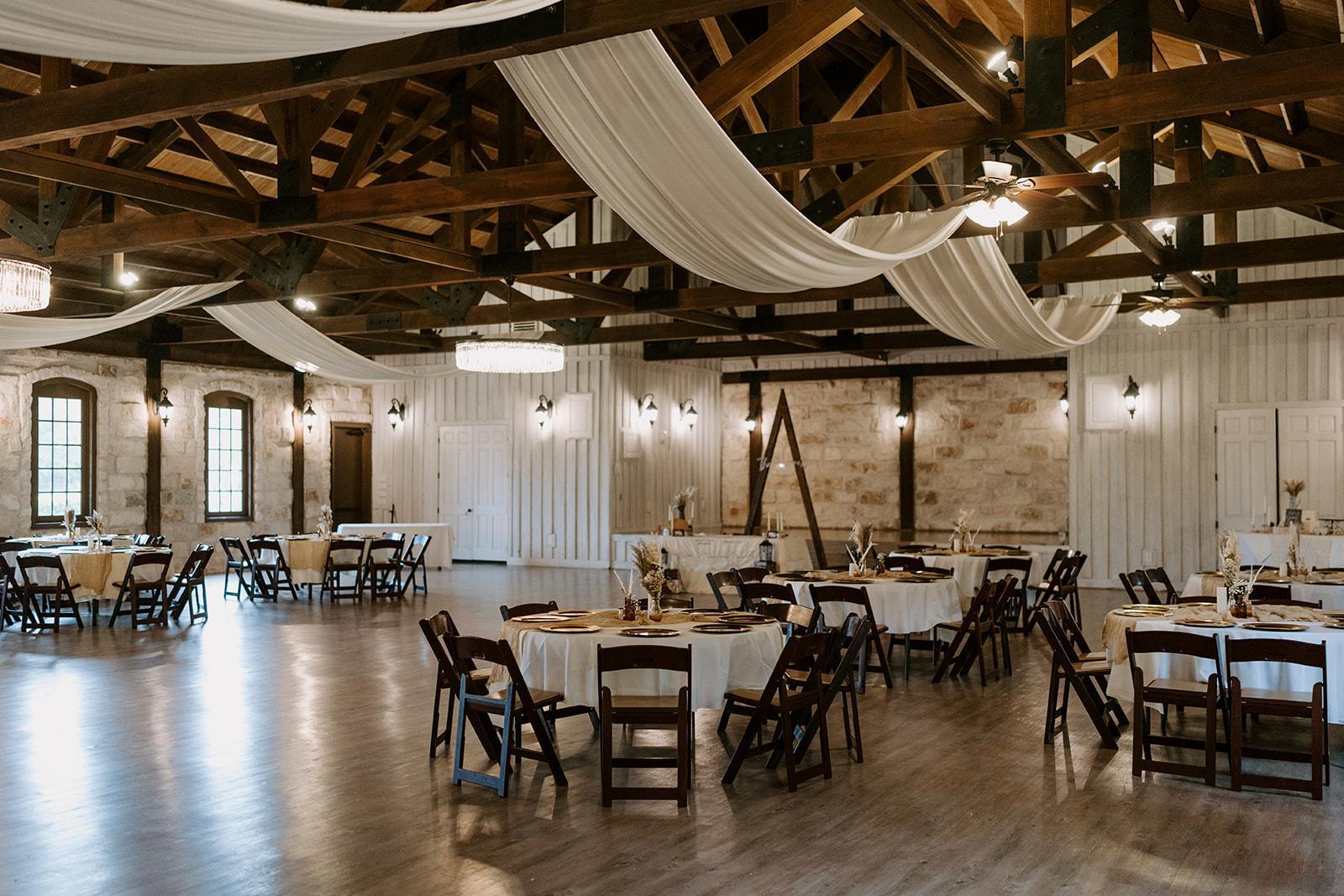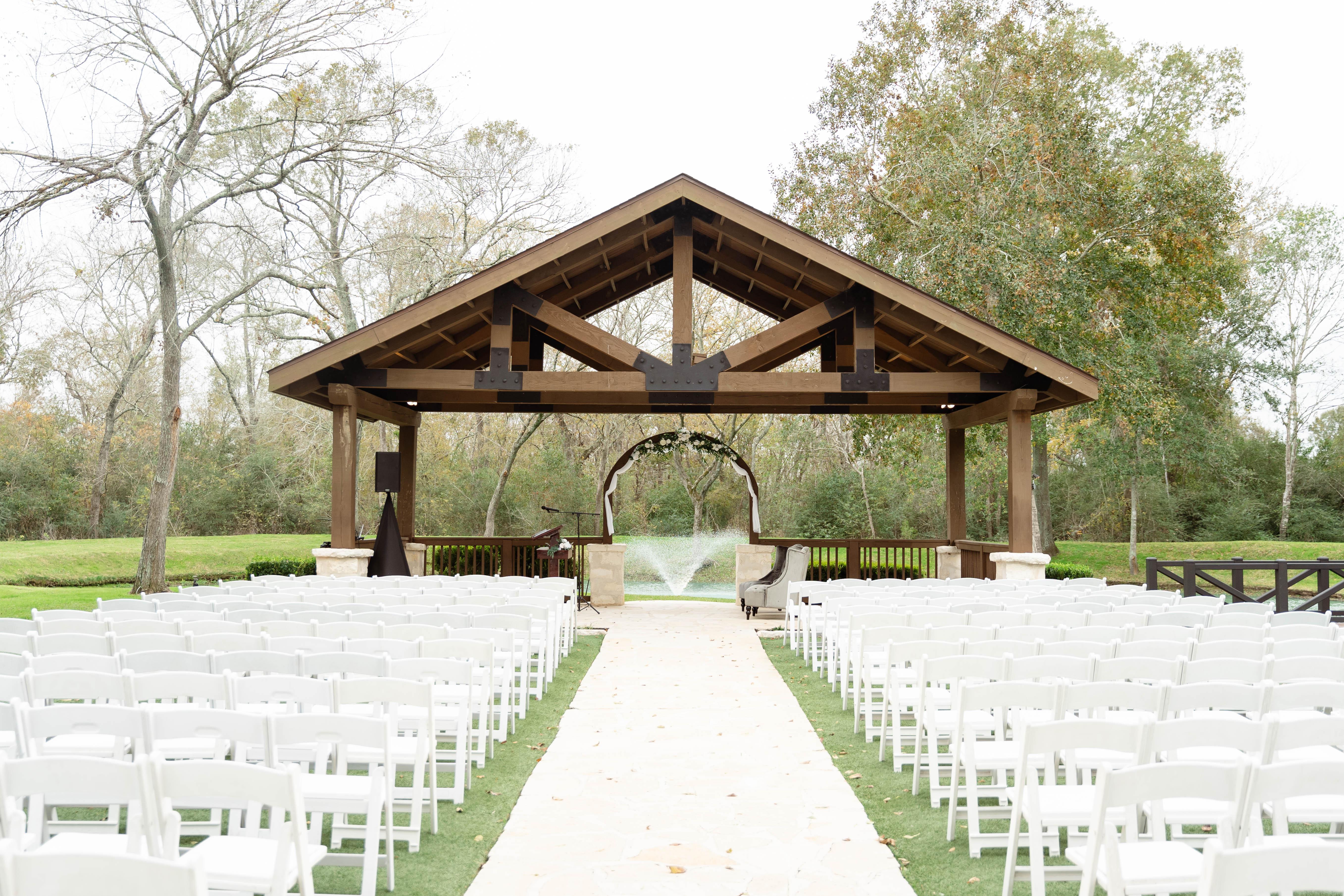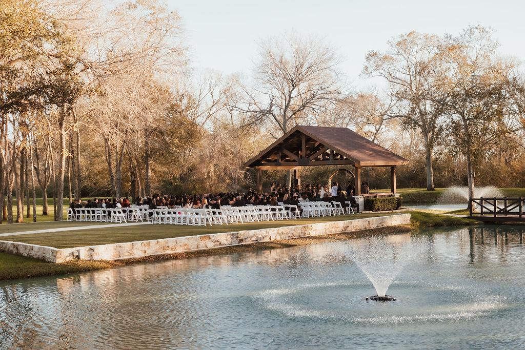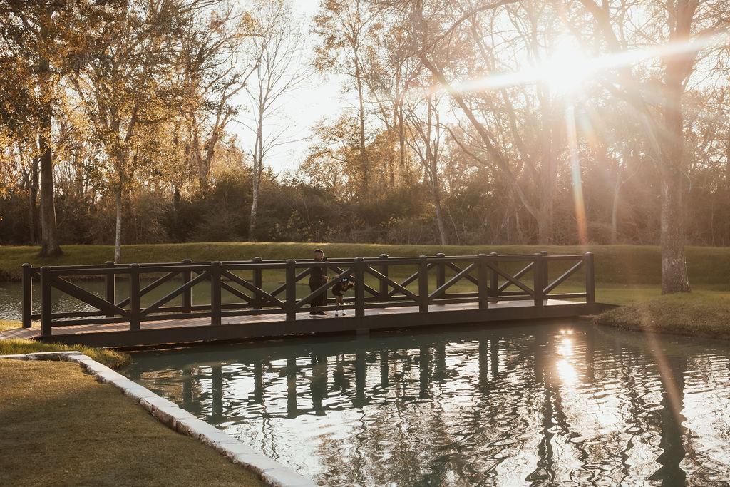 Stonecreek exudes classic elegance with bright stone walls, wooden trusses, and iconic cast iron doors in the reception space. The picturesque bridge overlooking a serene pond adds charm to the ceremony site, surrounded by the peaceful wooded landscape of Southeast Texas