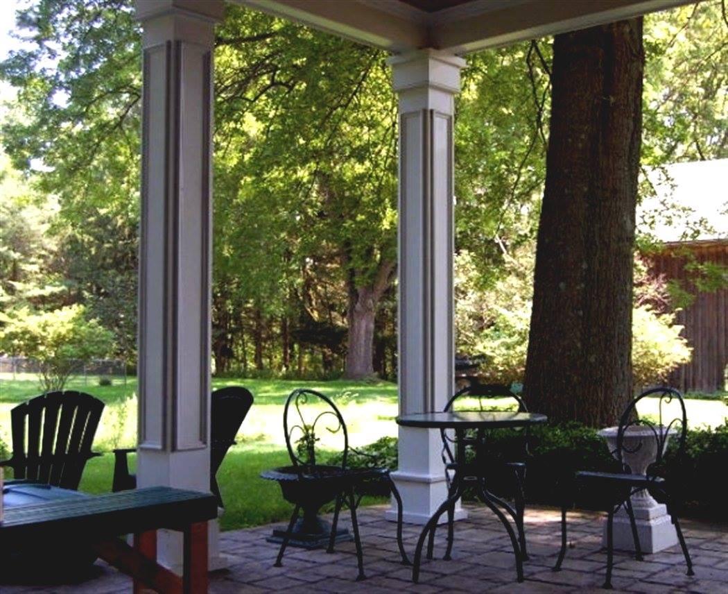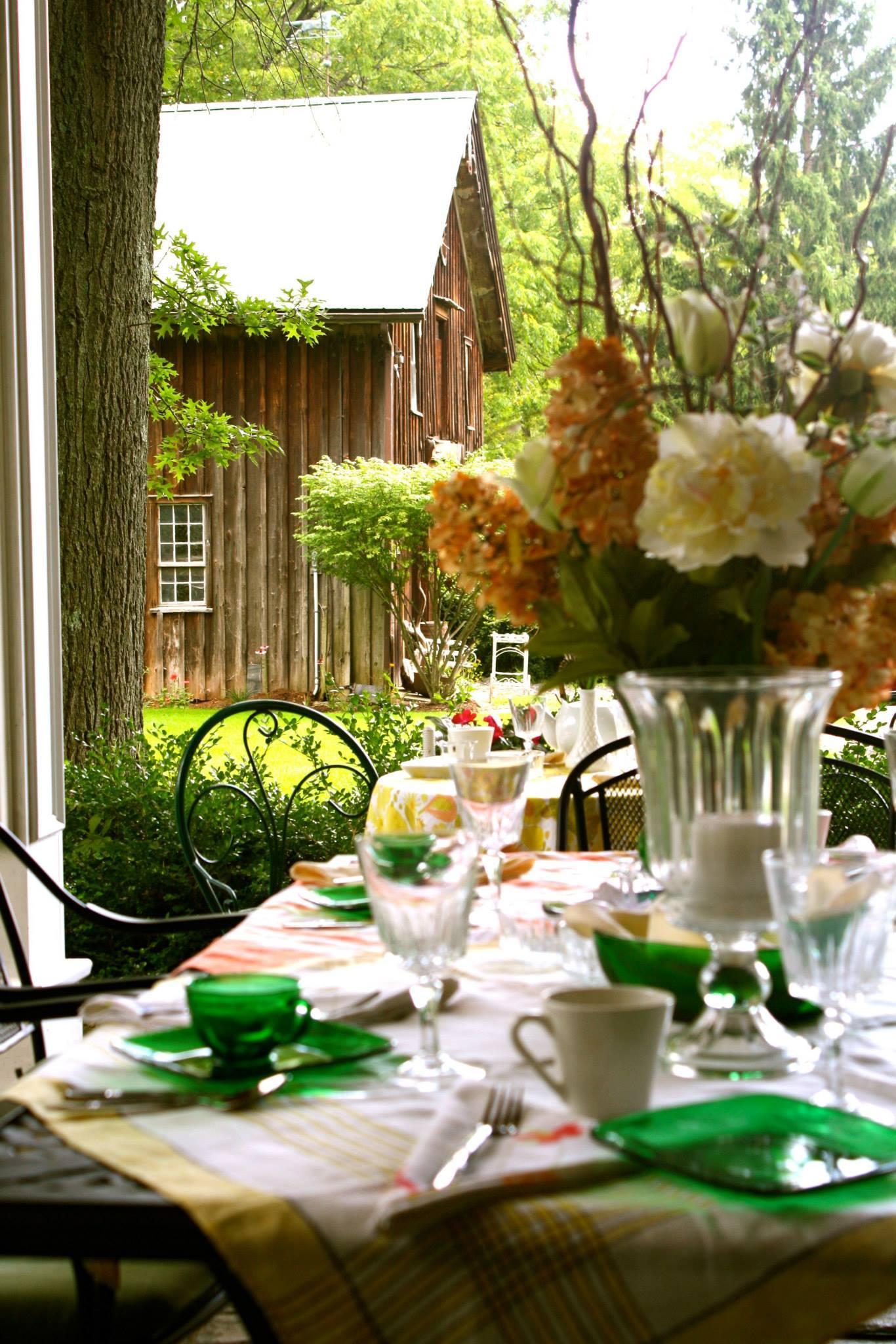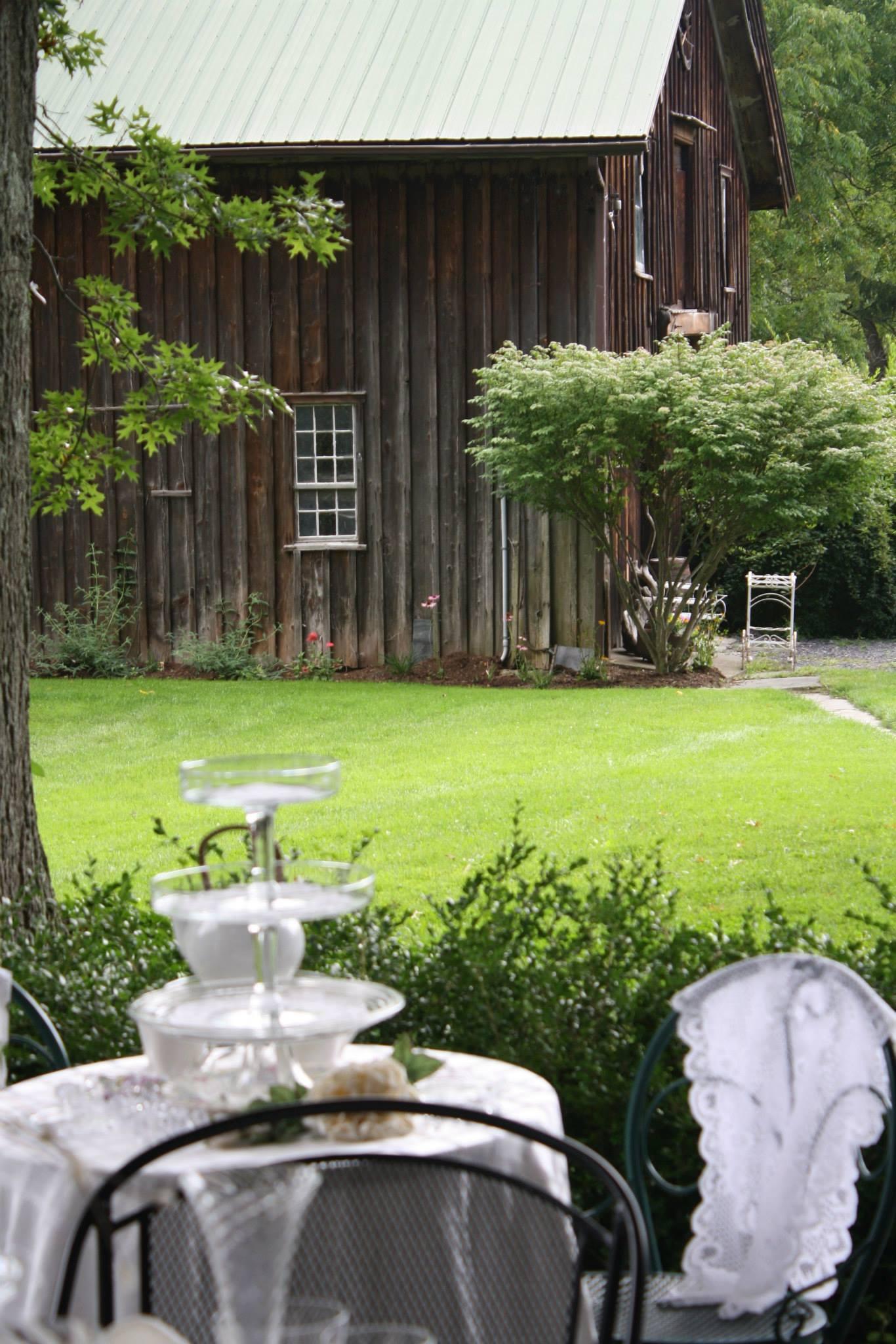 A regal stone-floored terrace overlooking the Gazebo, barn, and quaint rustic grounds. Flowers bloom all around the grounds!
