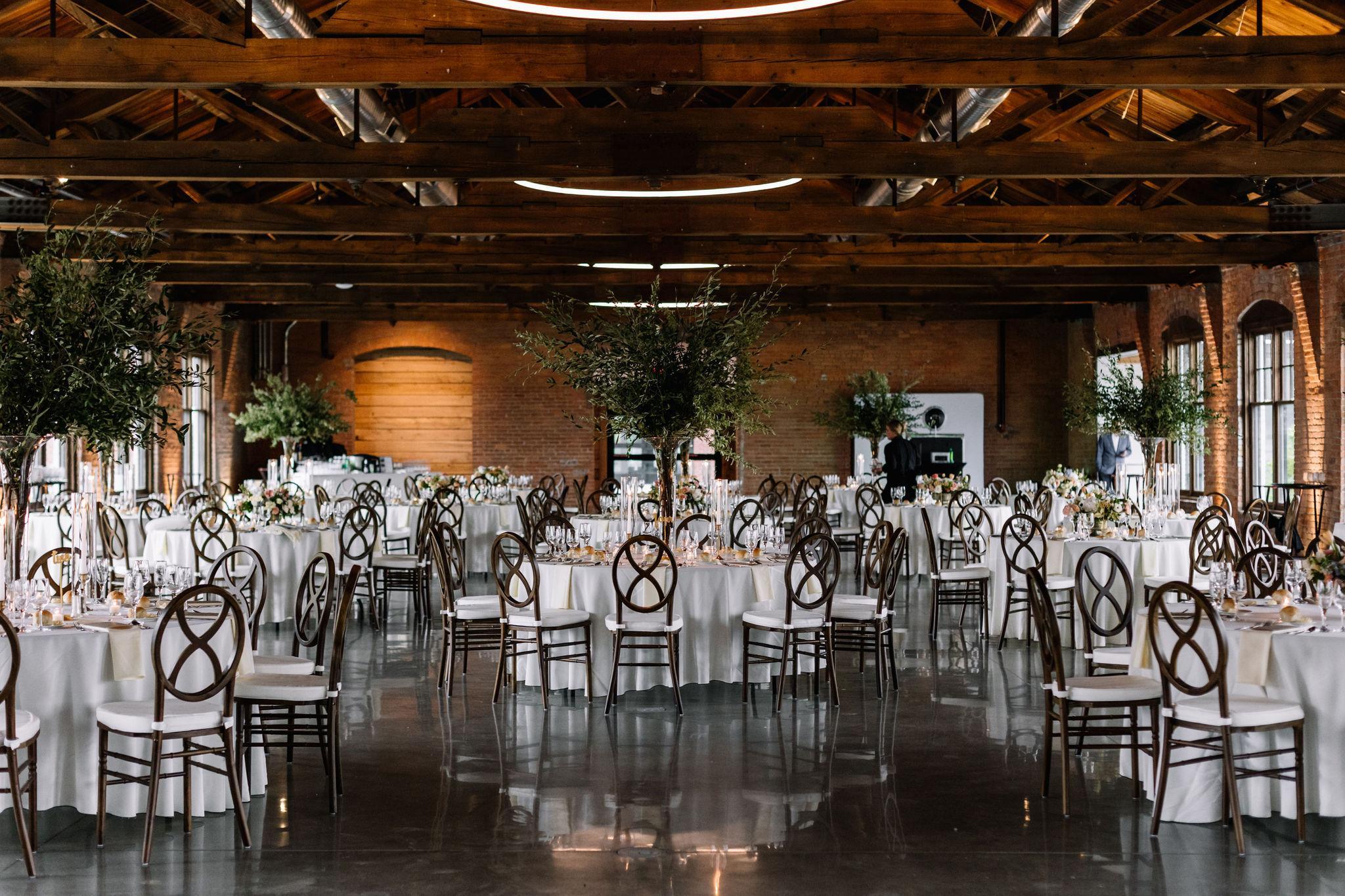 Our breathtaking industrial style ballroom was restored to keep its vaulted beam ceilings, floor to ceiling windows for plenty of natural lighting, and has concrete radiant heat floors for the colder months. The space can be separated into two event areas through the use of floor length draping.