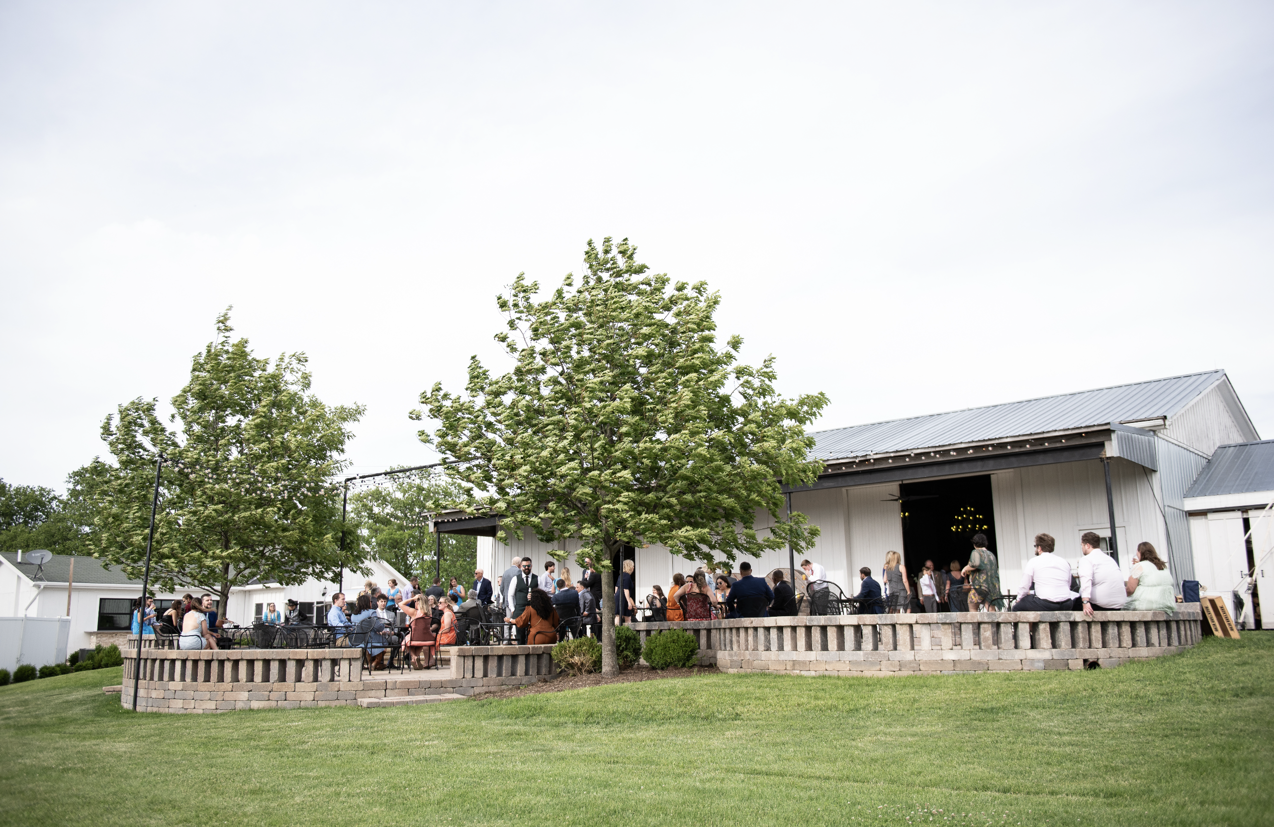 The Barn is one of our three ceremony spaces and offers a comfortable, temperature-controlled setting your ceremony, cocktail hour, post-dinner dancing and celebration. It features two large retractable doors that remain open throughout the day, creating a seamless indoor-outdoor experience. Just outside the doors, guests can enjoy our fully furnished stone patio with dueling fire pits, all overlooking 500 acres of picturesque farmland.