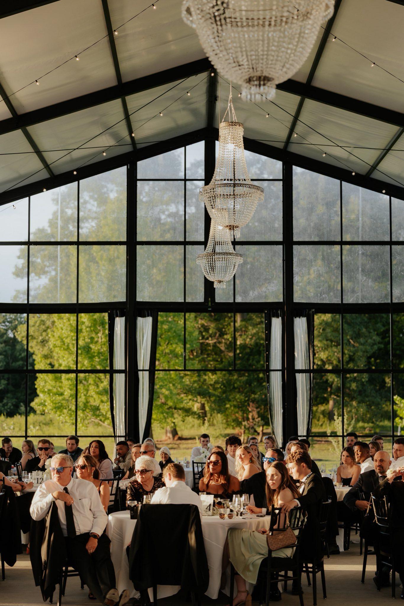 - Hanging Chandeliers & String Lights - Round Guest Tables - White Chairs - China, Glassware, Flatware - Full Service Wait Staff - Heat & AC