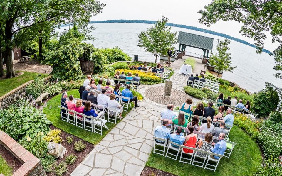 Waterfront perennial garden with lattice arches covered in beautiful vines and an ornate sundial offers theater style seating.