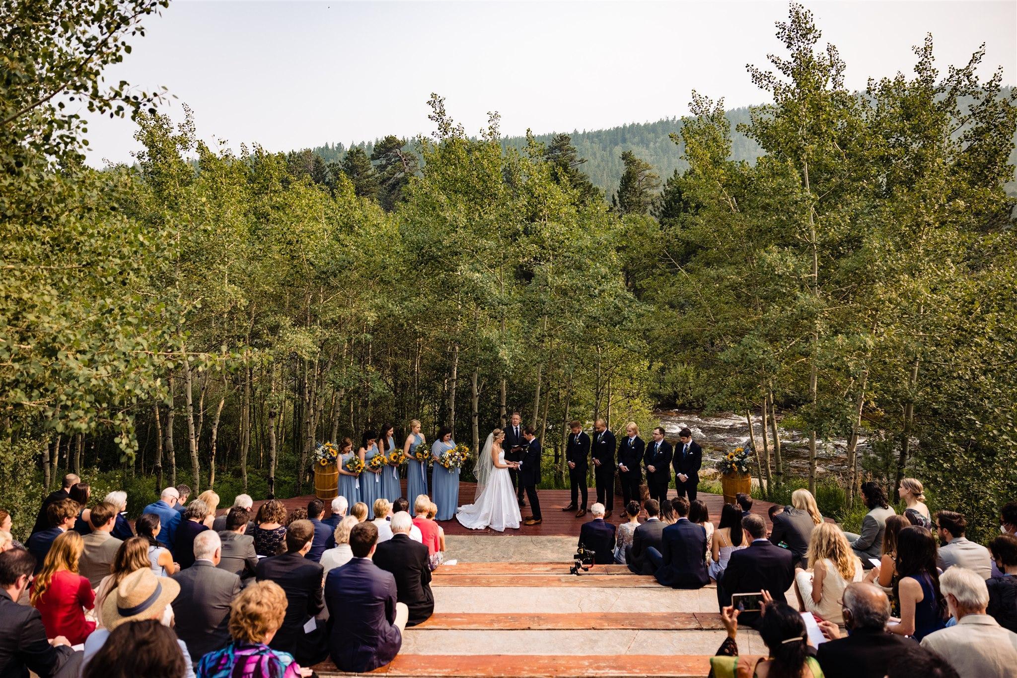Couples enjoy the St. Vrain River backdrop and Aspen trees surrounding our River Run wedding space. The amphitheater seating allows for the perfect set up for your guests to enjoy your ceremony, first dance, toasts, or dancing the night away under the stars.